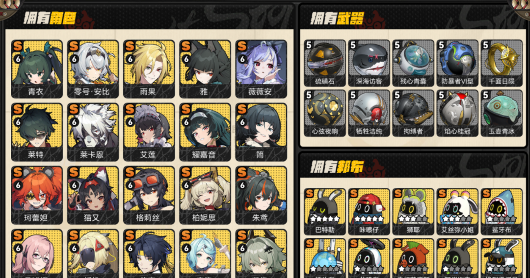 装备描述:60级;325黄;菲林底片:132;菲林:0;加密母带:13;24个S级代理人:满命青衣,满命零号·安比,满命雨果,满命雅,满命薇薇安,满命莱特,满命莱卡恩,满命艾莲,满命耀嘉音,满命简,满命珂蕾妲,满命猫又,满命格莉丝,满命柏妮思,满命朱鸢,满命月城柳,满命扳机,满命悠真,满命席德,满命凯撒,满命伊芙琳,满命仪玄,满命丽娜,满命11号;51个S级音擎:精5硫磺石,精5深海访客,精5残心青囊,精5防暴者VI型,精5千面日陨,精5心弦夜响,精5牺牲洁纯,精5拘缚者,精5焰心桂冠,精5玉壶青冰,精5索魂影眸,精5霰落星殿,精5灼心摇壶,精5嵌合编译器,精5时流贤者,精5淬锋钳刺,精5飞鸟星梦,精5啜泣摇篮,精5玲珑妆匣,精5奔袭獠牙,精3青溟笼舍,精1机巧心种,精5燃狱齿轮,精5钢铁肉垫,精5钢铁肉垫,精5硫磺石,精5拘缚者,精5嵌合编译器,精1钢铁肉垫,精1钢铁肉垫,精1硫磺石,精1千面日陨,精1燃狱齿轮,精1燃狱齿轮,精1拘缚者,精1拘缚者,精1拘缚者,精1拘缚者,精1拘缚者,精1拘缚者,精1嵌合编译器,精1嵌合编译器,精1嵌合编译器,精1时流贤者,精1啜泣摇篮,精1啜泣摇篮,精1啜泣