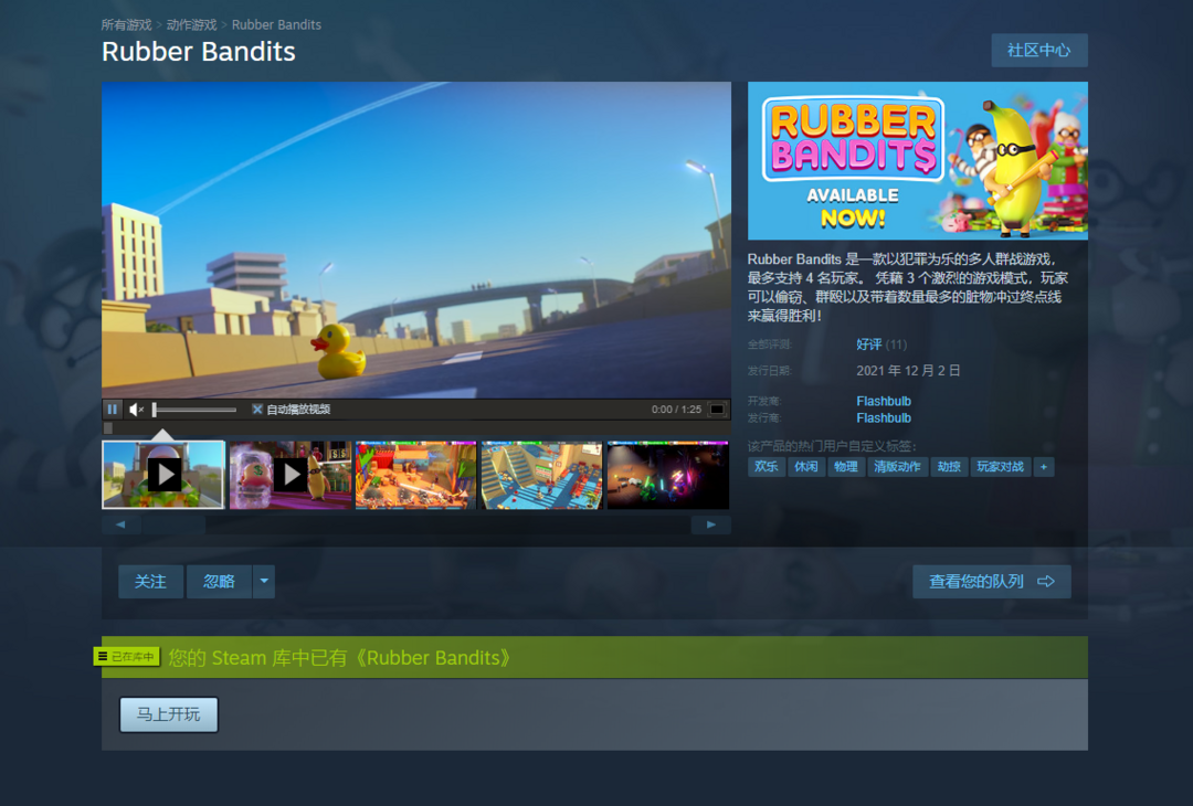 装备描述:Rubber Bandits 是一款以犯罪为乐的多人群战游戏,最多支持 4 名玩家。 凭藉 3 个激烈的游戏模式,玩家可以偷窃、群殴以及带着数量最多的脏物冲过终点线来赢得胜利!