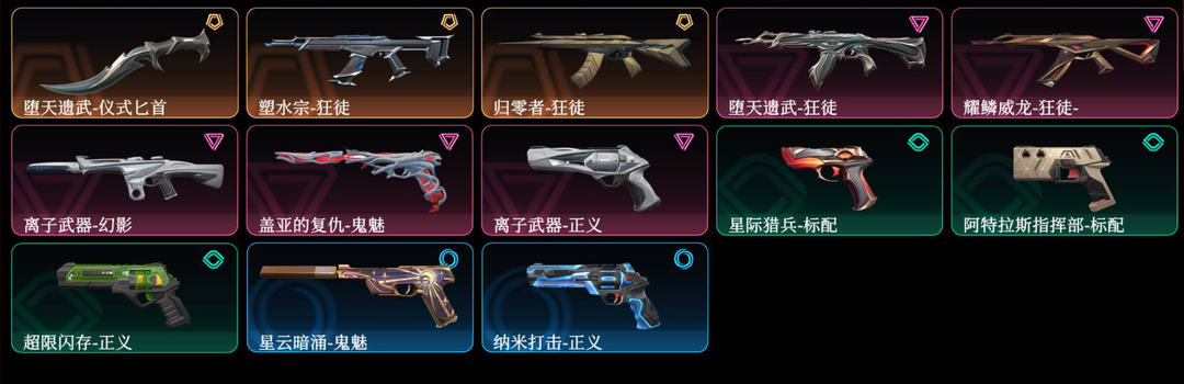 装备描述:塑水狂徒✨弃王狂徒✨龙年狂徒✨离子幻影✨归零狂徒✨盖亚鬼魅✨离子正义✨弃王匕首