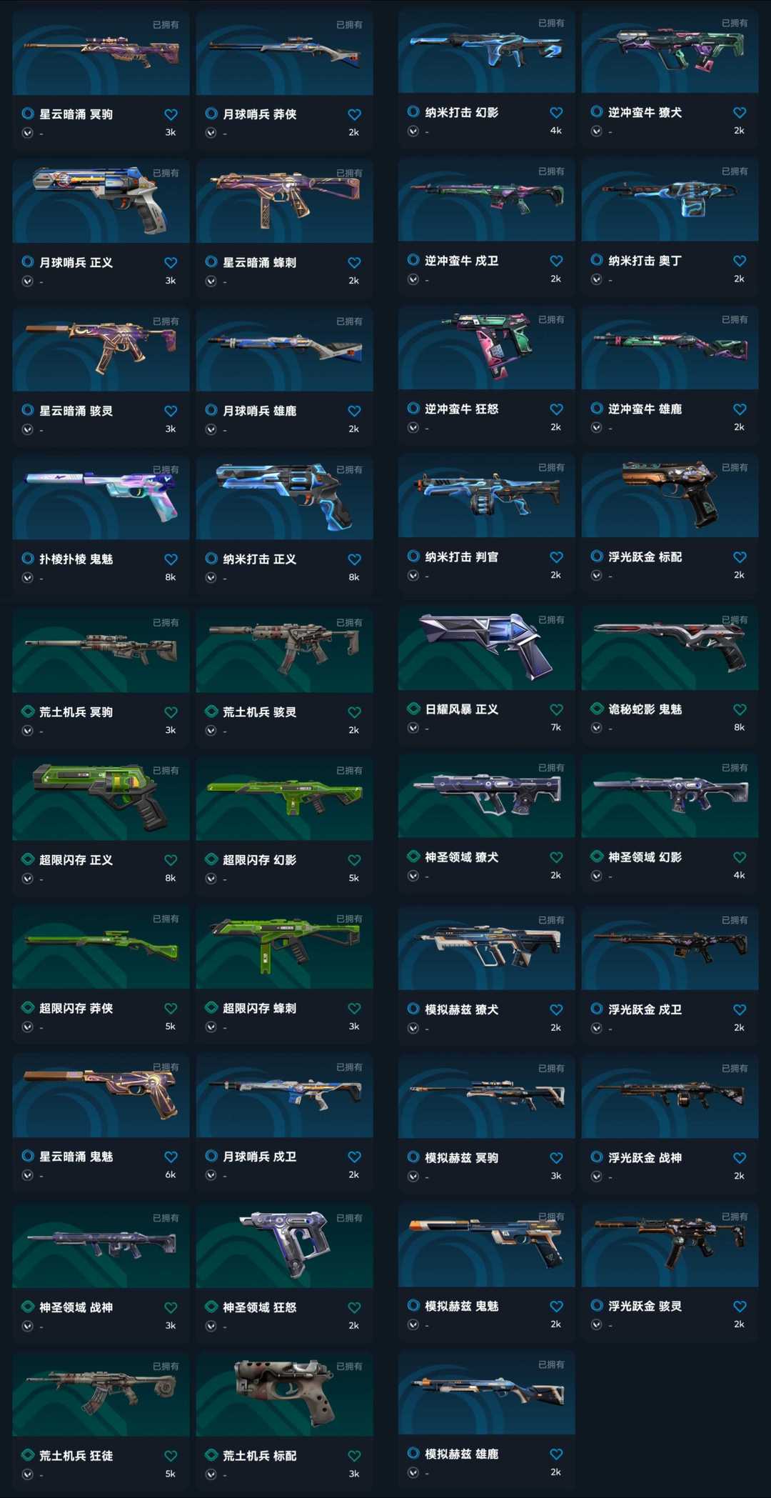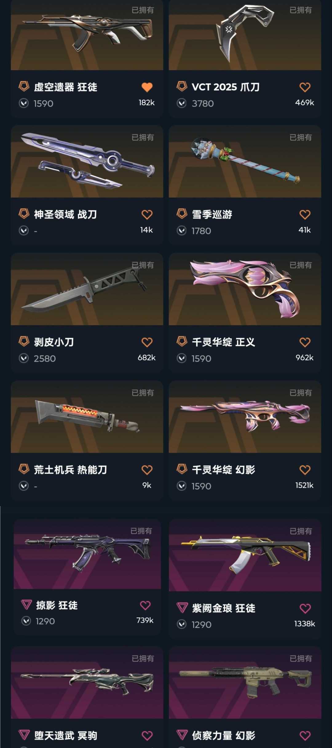 可排位♉VCT爪刀、狂徒/紫金/掠夺/虚空、幻影/莲花/侦察、天界大狙、莲花正义剥皮小刀雪棒、全英雄
