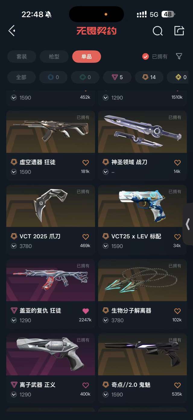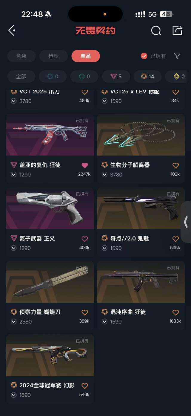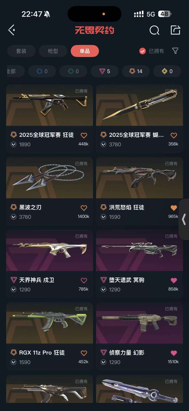 装备描述:炒饭段位 盖亚的复仇 狂徒 侦察力量幻影 天界神兵 戍卫 洪荒怒焰 狂徒 2024全球冠军赛幻影 混沌序曲 狂徒 神圣领域 幻影 神圣领域 獠犬 月球哨兵 戍卫 虚空遗器 狂徒 RGX 11z Pro 狂徒 2025全球冠军赛 狂徒 堕天遗武 冥驹 侦察力量蝴蝶刀 黑波之刃 生物分子解离器 神圣领域 战刀 VCT 2025 爪刀 2025全球冠军赛蝴蝶刀 离子正义 奇点鬼魅