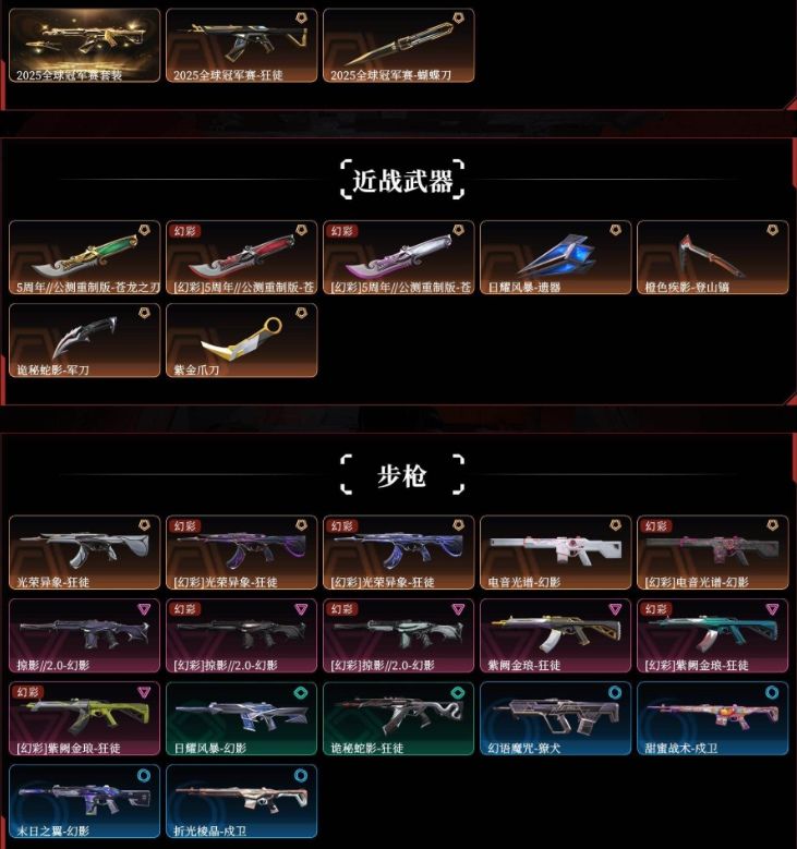 装备描述:可排位✨3w库存600R点✨2025全球冠军赛套装(2025全球冠军赛-狂徒,2025全球冠军赛-蝴蝶刀 )✨5周年//公测重制版-苍龙之刃,日耀风暴-遗器,橙色疾影-登山镐,诡秘蛇影-军刀,紫金爪刀✨荣异象-狂徒,电音光谱-幻影,掠影//2.0-幻影,紫阙金琅-狂徒✨掠影//2.0-奥丁✨艾沃莉的梦之翼-骇灵✨VCT25-x-BLG-标配,艾沃莉的梦之翼-鬼魅,离子武器-正义✨