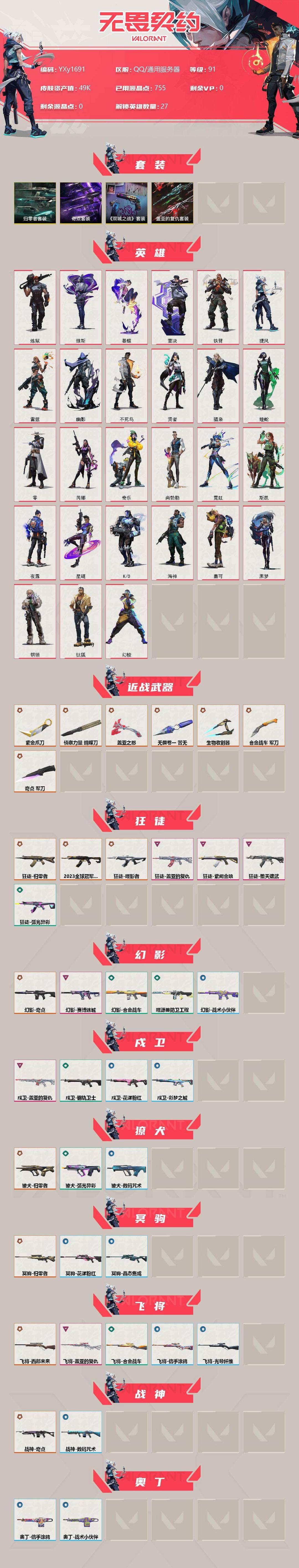 装备描述:套装】:《英雄联盟:双城之战》套装,奇点套装,归零者套装,盖亚的复仇套装 【英雄】:幻棱,炼狱,维斯,暮蝶,钛狐,壹决,铁臂,捷风,雷兹,幽影,不死鸟,贤者,猎枭,蝰蛇,零,芮娜,奇乐,尚勃勒,霓虹,斯凯,夜露,星礈,K/O,海神,盖可,黑梦,钢锁 【近战 武器】:近战武器-无畏契约GO!第一卷 苦无,近战武器-侦察力量 蝴蝶刀,近战武器-紫金爪刀,近战武器-奇点 军刀,近战武器-盖亚之怒,近战武器-合金战车 军刀,近战武器-生物收割器 【狂徒】:狂徒-2023全球冠军赛,狂徒-归零者,狂徒-噬影者,狂徒-堕天遗武,狂徒-盖亚的复仇,狂徒-紫阙金琅,狂徒-弧光异彩 【幻影】:幻影-奇点,幻影-博迷城,幻影-合金战车,幻影-噬源兽防卫工程,幻影-战术小伙伴 【戍卫】:戍卫-盖亚的复仇,戍卫-钢轨卫士,戍卫-彩梦之城,戍卫-花漾粉红 【獠犬】:獠犬-归零者,獠犬-弧光异彩,獠犬-数码咒术 【冥驹】:冥驹-归零者,冥驹-花漾粉红,冥驹-晶态集成 【飞将】:飞将-西部未来,飞将-盖亚的复仇,飞将-合金战车,飞将-信手涂鸦,飞将-光导纤维 【战神】:战神-奇点,战神-数码咒术 【奥丁】:奥丁-