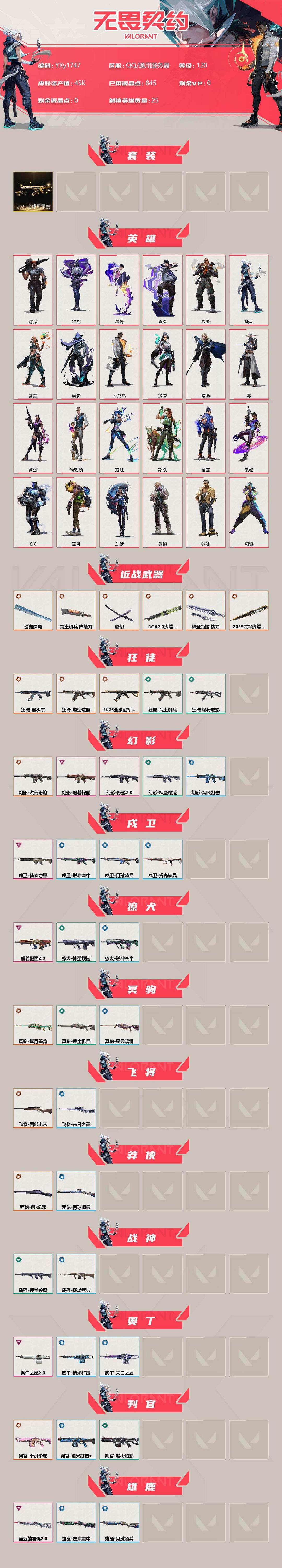 装备描述:【套装】:2025全球冠军赛套装 【英雄】:幻棱,炼狱,维斯,暮蝶,钛狐,壹决,铁臂,捷风,雷兹,幽影,不死鸟,贤者,猎枭,零,芮娜,尚勃勒,霓虹,斯凯,夜露,星礈,K/O,盖可,黑梦,钢锁 【近战 武器】:近战武器-2025全球冠军赛 蝴蝶刀,近战武器-RGX 11z Pro//2.0 蝴蝶刀,近战武器-镭切,近战武器-澄湖潋滟,近战武器-荒土机兵 热能刀,近战武器-神圣领域 战刀 【狂徒】:狂徒-2025全球冠军赛,狂徒-塑水宗,狂徒-虚空遗器,狂徒-荒土机兵,狂徒-诡秘蛇影 【幻影】:幻影-洪荒怒焰,幻影-般若假面,幻影-掠影//2.0,幻影-神圣领域,幻影-纳米打击 【戍卫】:戍卫-侦察力量,戍卫-逆冲蛮牛,戍卫-月球哨兵,戍卫-折光棱晶 【獠犬】:獠犬-般若假面//2.0,獠犬-神圣领域,獠犬-逆冲蛮牛 【冥驹】:冥驹-偃月苍龙,冥驹-荒土机兵,冥驹-星云暗涌 【飞将】:飞将-西部未来,飞将-末日之翼 【莽侠】:莽侠-创·纪元,莽侠-月球哨兵 【战神】:战神-神圣领域,战神-沙场老兵 【奥丁】:奥丁-海洋之星//2.0,奥丁-纳米打击,奥丁-末日之翼 【判官】:判官-千灵华绽