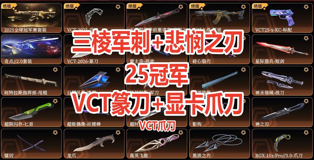 可排位✅顶级10W库存✅超时空三棱刀⭐25冠军套⭐VCT篆刀⭐季前邀请赛悲悯之刃⭐VCT爪刀⭐显卡爪