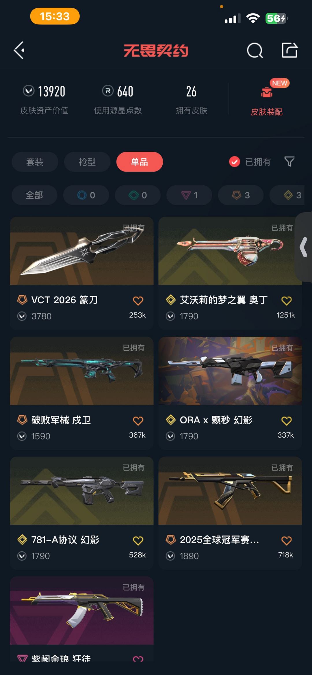 英雄29皮肤26皮肤资产价值13920VCT26、25冠军