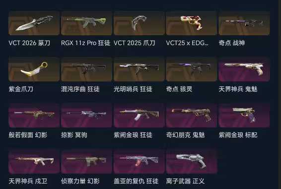 可排位✨VCT25-26✨紫金抓✨盖亚紫金混沌光明狂徒✨侦查假面幻影✨掠夺大狙✨天界朋克鬼魅✨离子正
