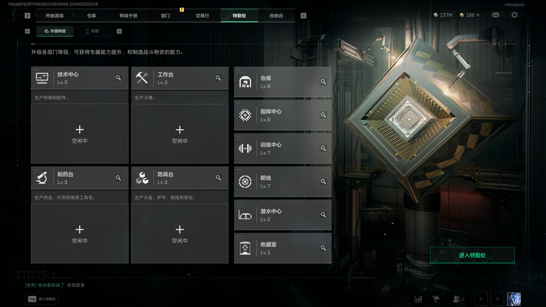 装备描述:靶场等级:7,训练中心等级:7,仓库等级:8,仓库东西随便用