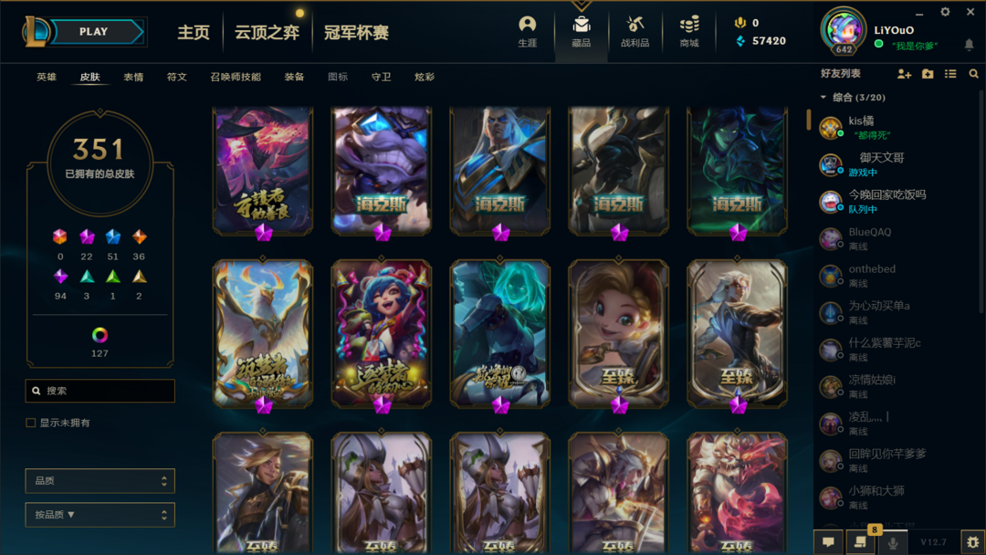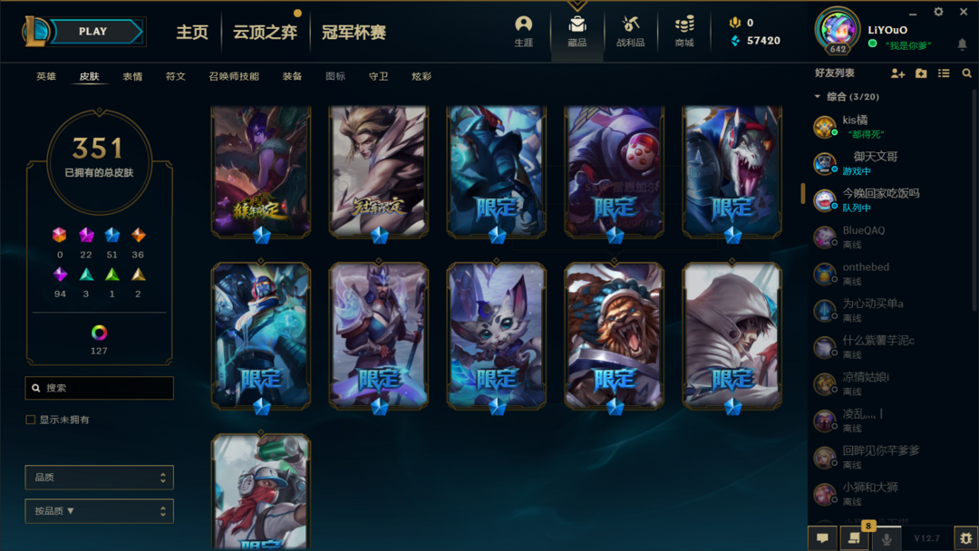 装备描述:350款皮肤,各类至臻(狗熊、卡莎、剑魔、瑞文、凯茵、劫、龙年男刀、玉剑仙男刀女刀、花木兰、各类传说皮肤都有、随意畅玩