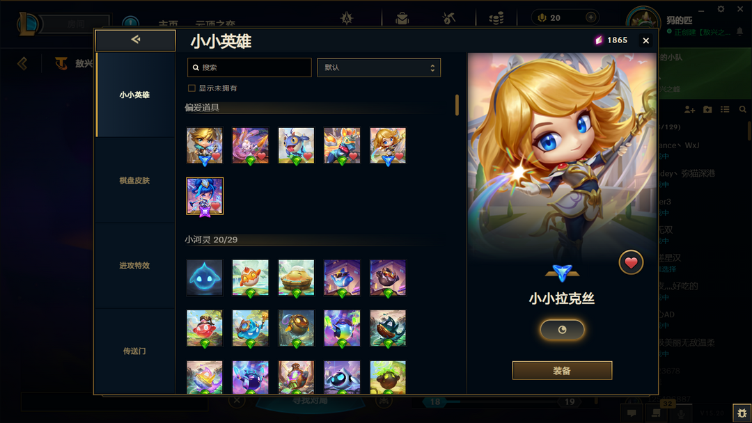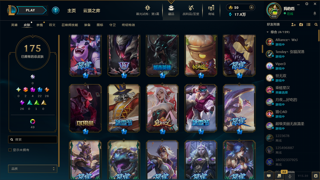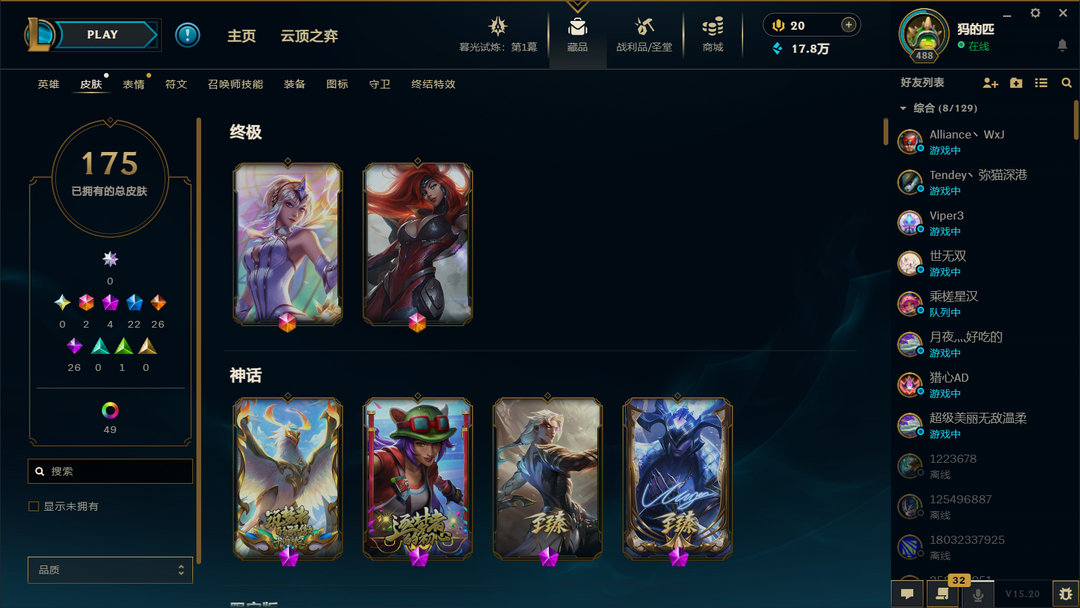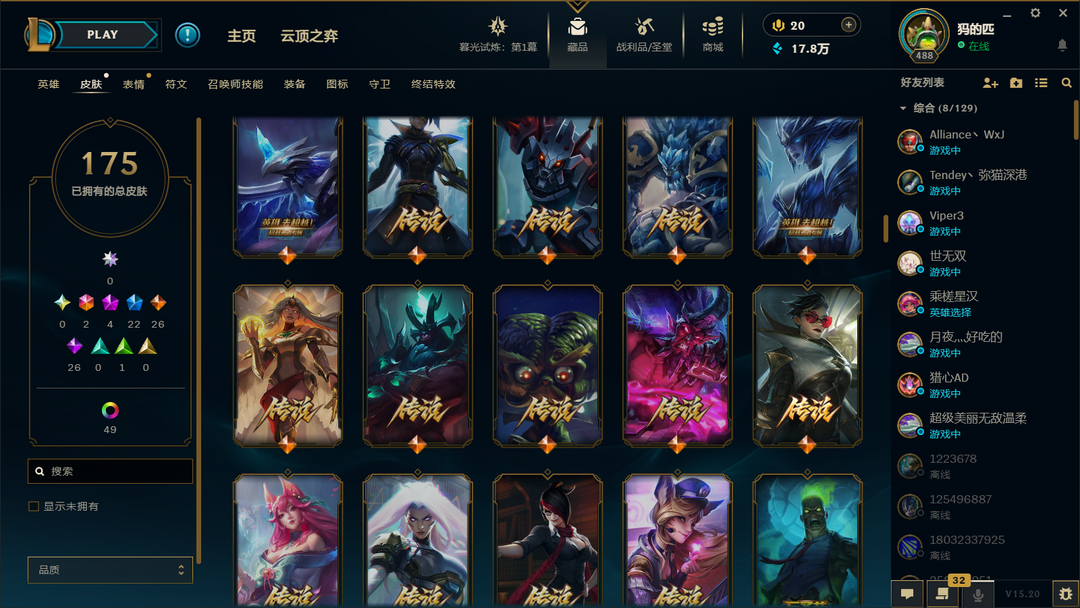 装备描述:至臻凯隐 神王诺手 黑帮男枪 霸天剑魔 奥德赛凯隐三炫彩 御剑剑姬 魔女乐芙兰 青花瓷冰女 武神贾克斯 IG剑姬 兔年刀妹 武装战姬 大天使拉克丝 18棋牌 155小小英雄