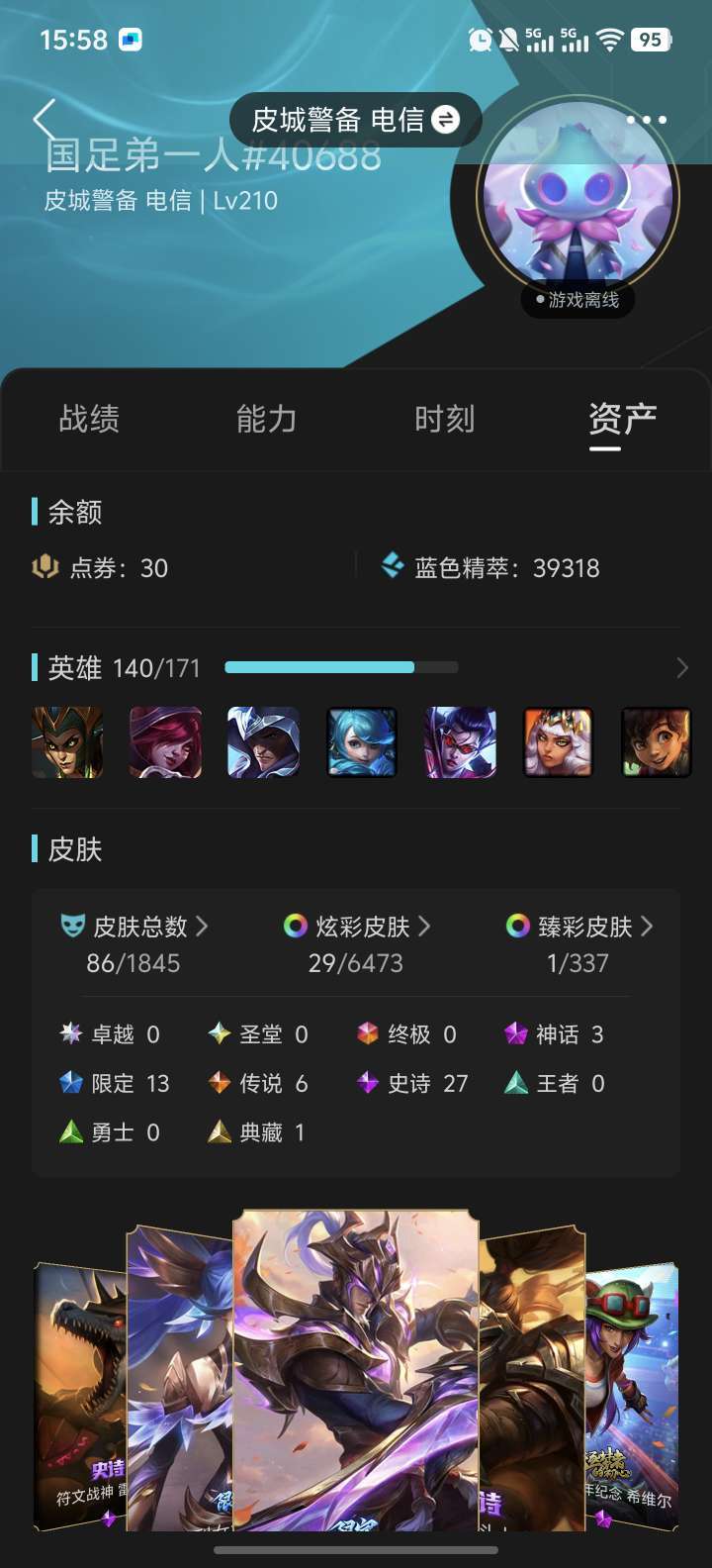 皮城警备210级,段位白银一,未打定级赛140个英雄,100个皮肤,13限定,6传说,27史诗皮肤