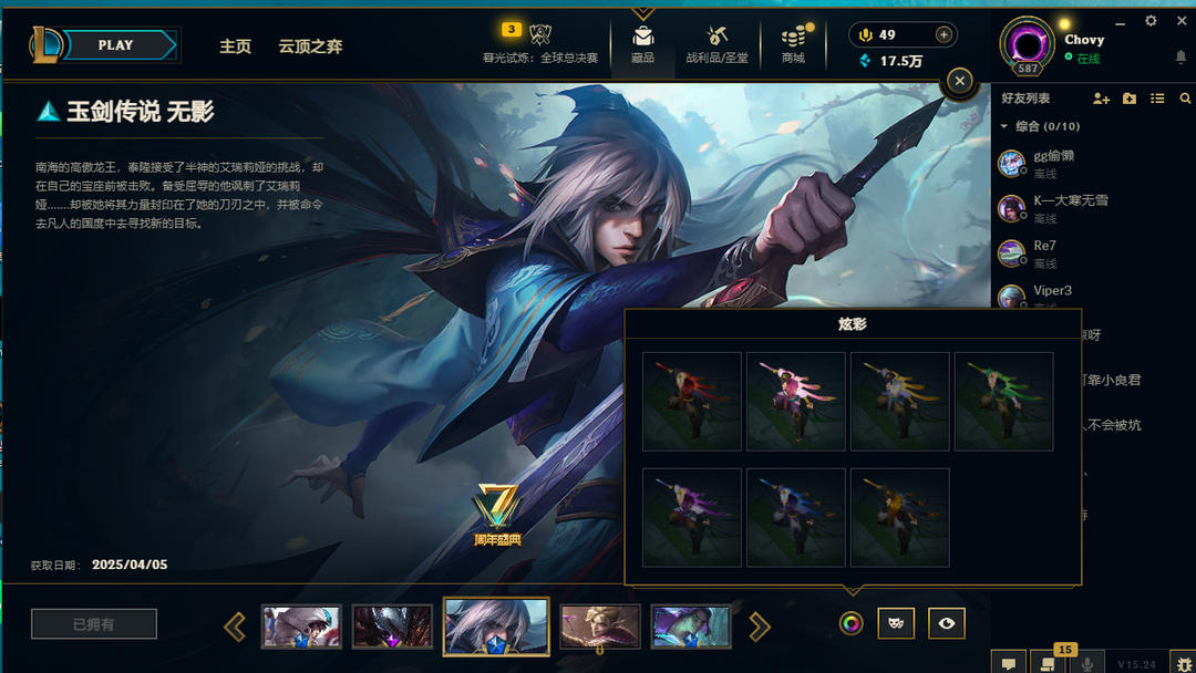 装备描述:全英雄400皮肤炫彩多35海克斯至臻皮肤男刀玉剑传说加粉色炫彩