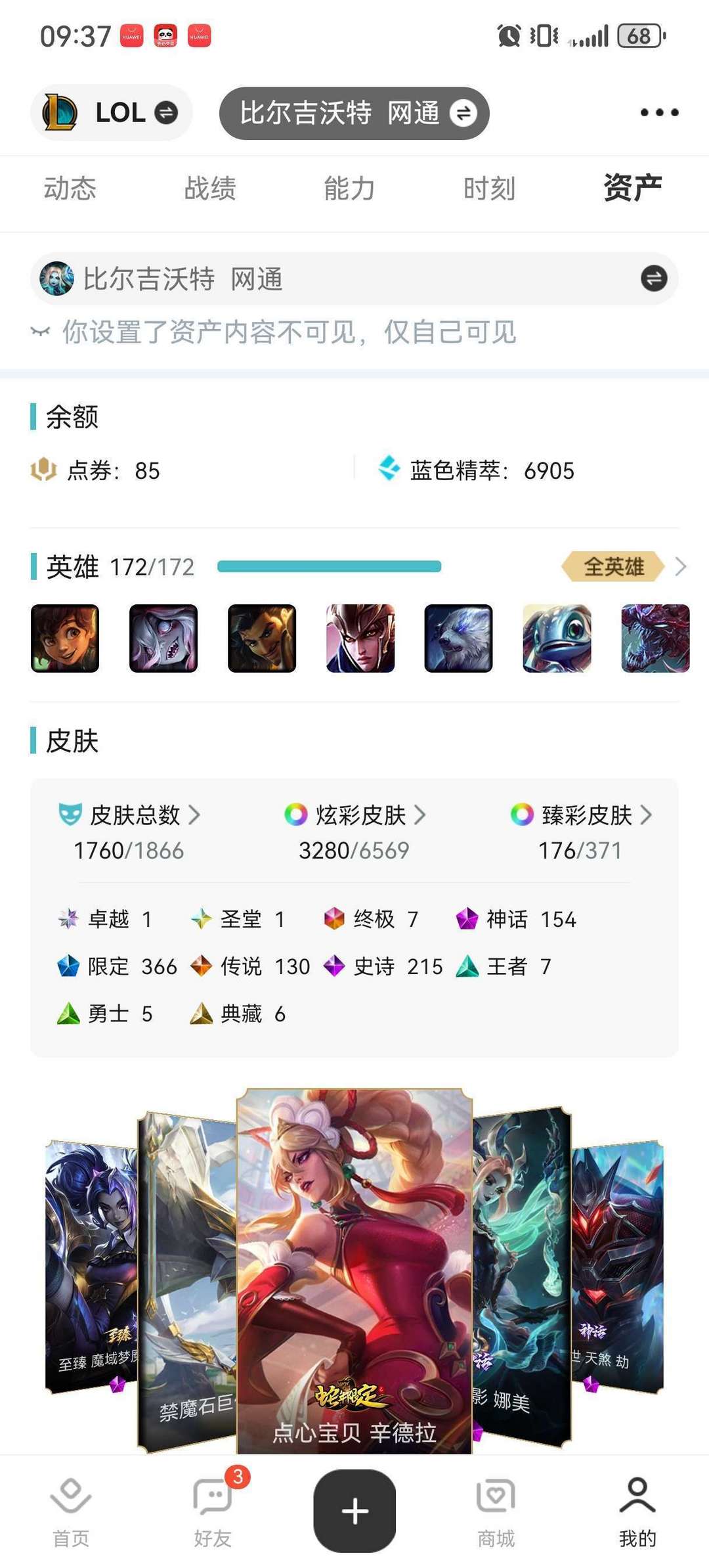 装备描述:比尔吉沃特1757皮肤 3250炫彩,劫的新神话皮肤,紫色新龙瞎,卢锡安,金克丝,佐伊新皮肤已保底抽出来,幸运之门所有皮肤也出来了