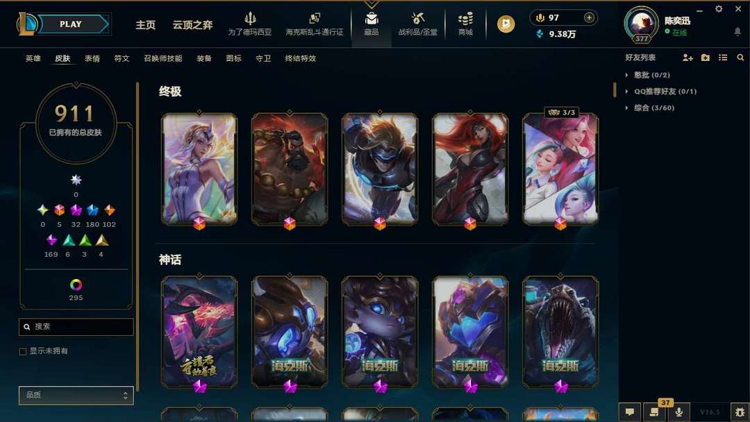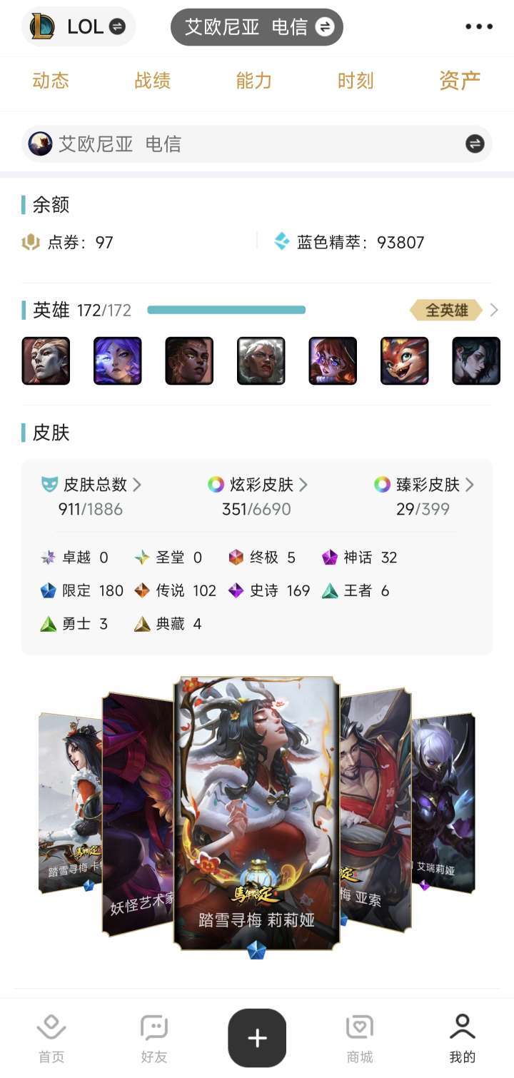 各种稀有传说皮肤,冠军套装,900加皮肤。踏雪寻梅莉莉娅皮肤炫彩已入手。