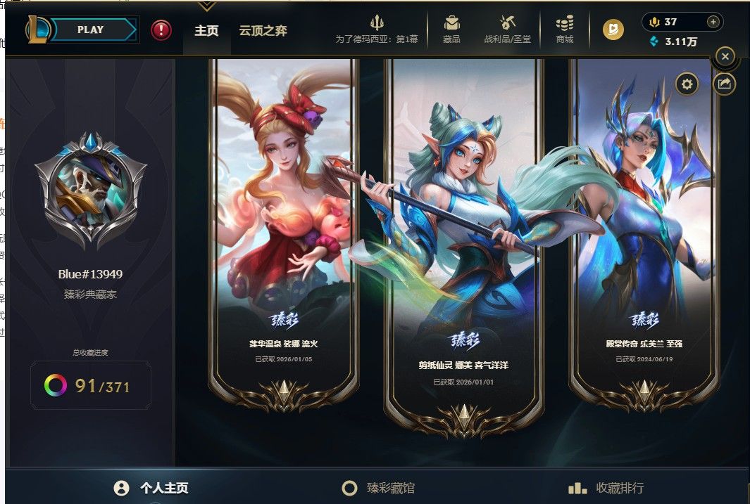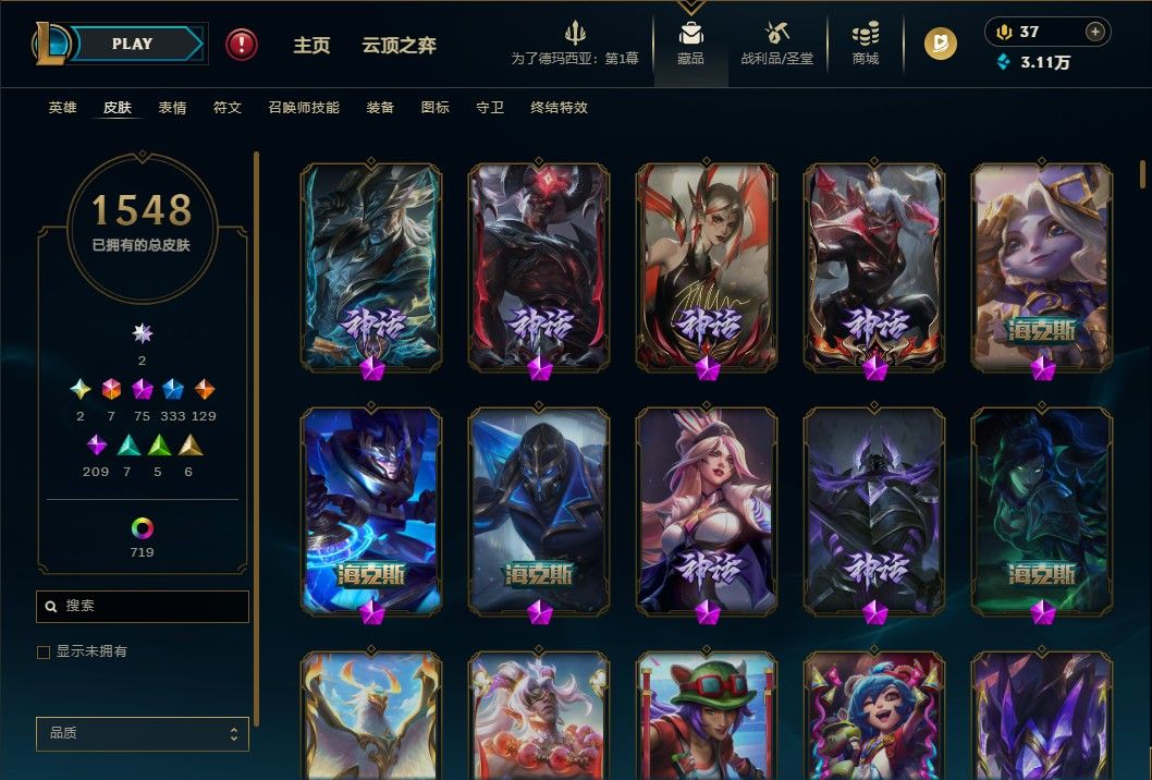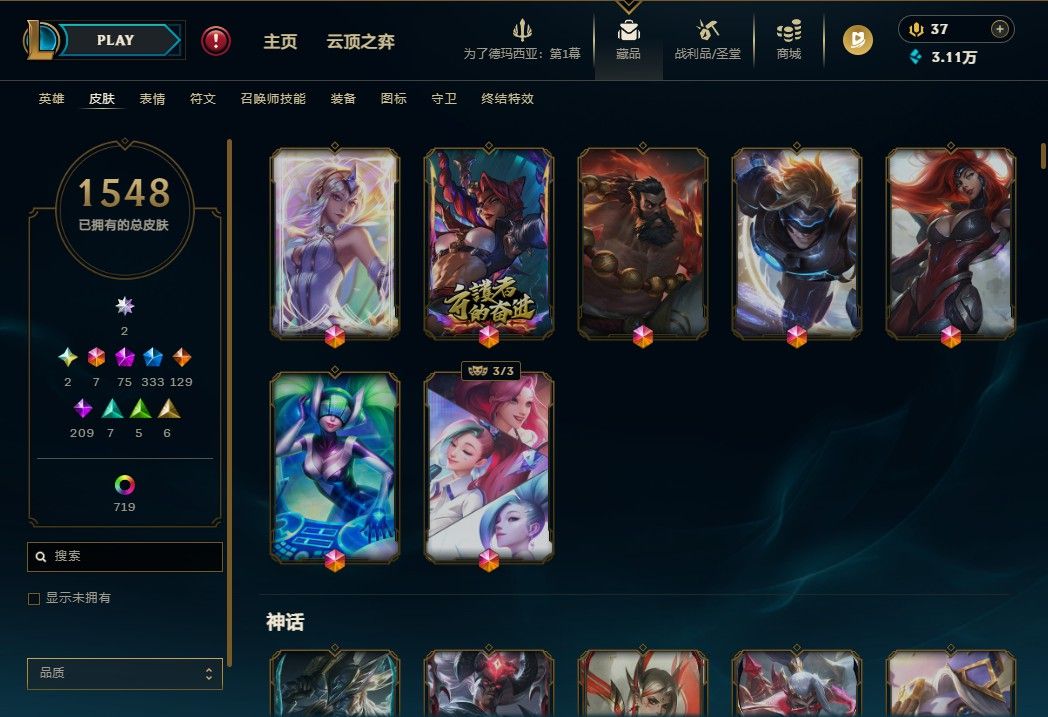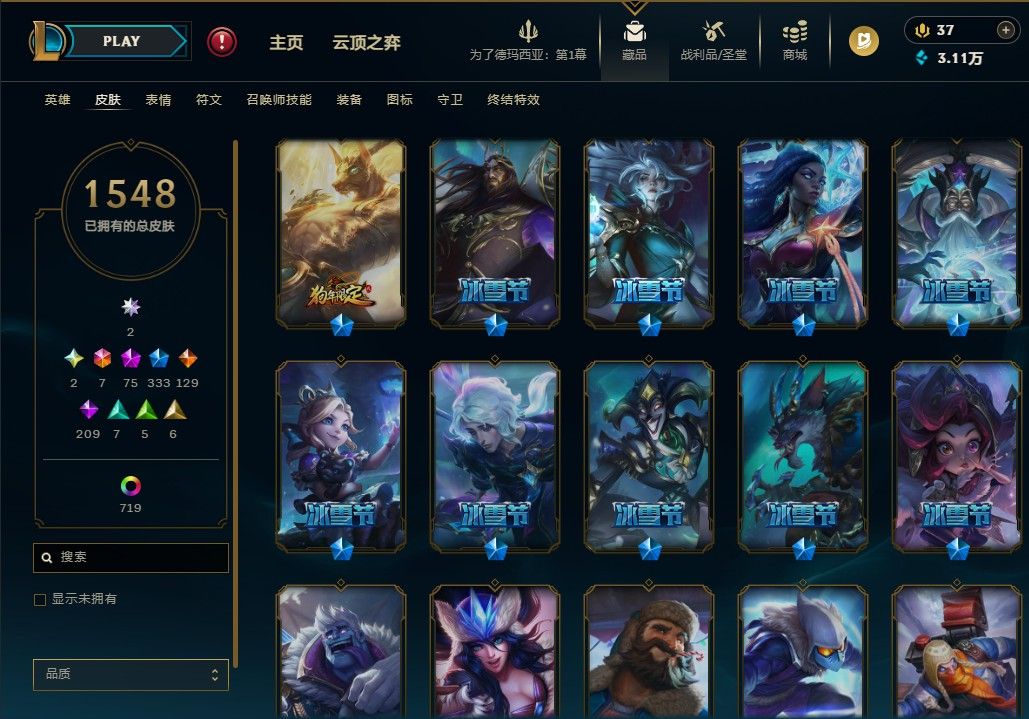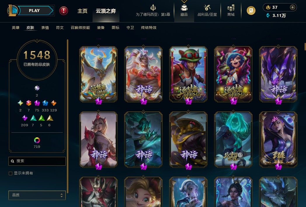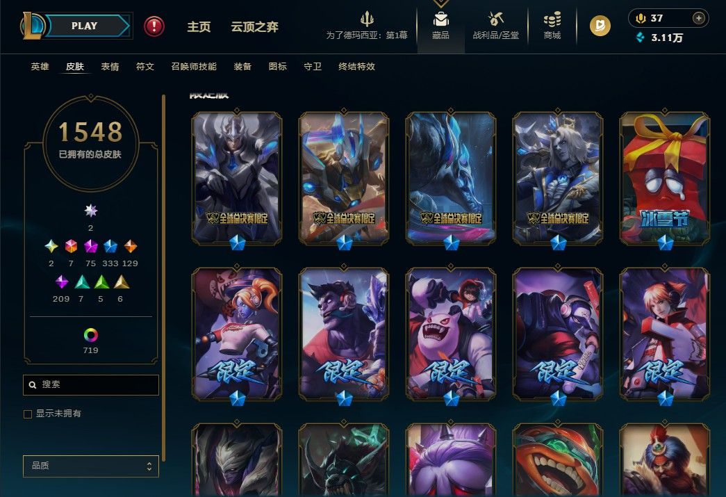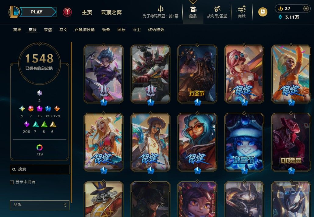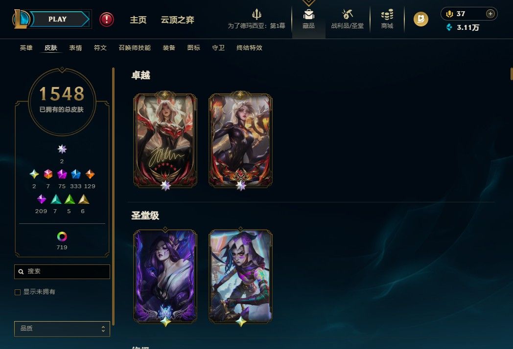 原皮1550签名狐狸.联盟不朽卡莎.双城之战破碎者金克丝.沉溺暗影卢锡安十几套冠军皮肤等等