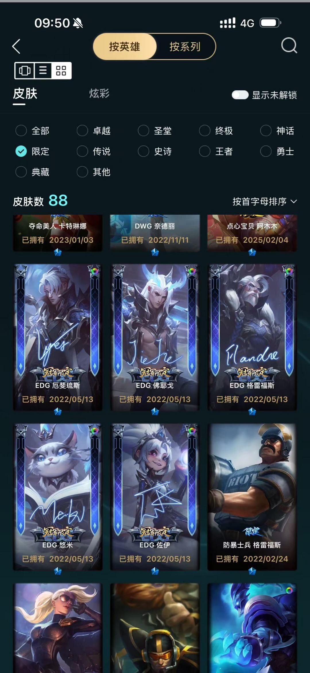 装备描述:北极星使者 彗;天龙之子 斯莫德;至臻 至高天 奎桑提;黑夜使者 莉莉娅;心之钢 瑟提;灵魂莲华 瑟提;龙腾虎跃 瑟提;泳池派对 瑟提;神龙尊者 炎龙瑟提;机神苍狼 瑟提;至臻 心之钢 永恩;黎明使者 永恩;灵魂莲华 永恩;源计划:毁灭 派克;腥红之月 派克;心之钢 厄斐琉斯;EDG 厄斐琉斯;黑夜使者 厄斐琉斯;山海绘卷 妮蔻;灰烬杀手 塞拉斯;幻灵战斗狼 塞拉斯;至臻 源计划:逆流 塞拉斯;弗雷尔卓德 塞拉斯;嘟!嘟 !奥恩;至臻 神凰行者 烈羽焰凰 霞;暮星之羽 霞;绝息圣堂 洛;巴德·吟游诗人;永恒之森 巴德;SKT T1 卡莉丝塔;灌篮高手 艾翁;泳池派对 雷克塞;水瓶星神 俄洛伊;抵抗军炎魔 俄洛伊;虚空使者 俄洛伊;至臻 未来战士 锤石;腥红之月 锤石;冠军典狱长 锤石;太空律动 “音浪狂舞” 莎弥拉;EDG 悠米;永恒之森 阿兹尔;SKT T1 阿兹尔;锦鲤 娜美;至臻 腥红之月 亚托克斯 (2022);至臻 腥红之月 亚托克斯;霸天剑魔 亚托克斯;双城之战 蔚;源计划:裁决 蔚;炼狱魔女 蔚;铁拳执事 蔚;霓虹杀拳 蔚;至臻 真实伤害 奇亚娜;真实伤害 艾克;任性学霸