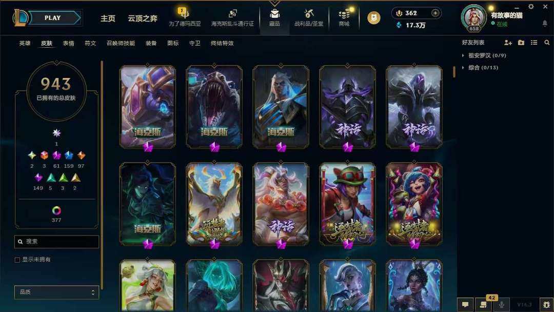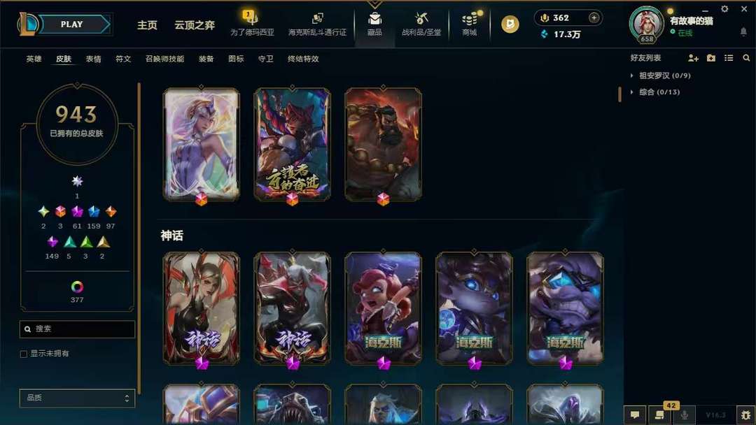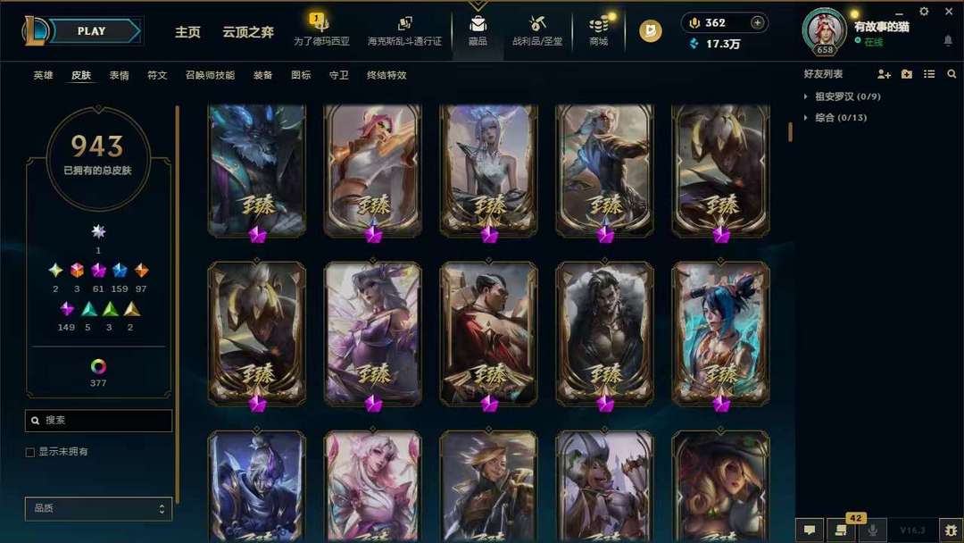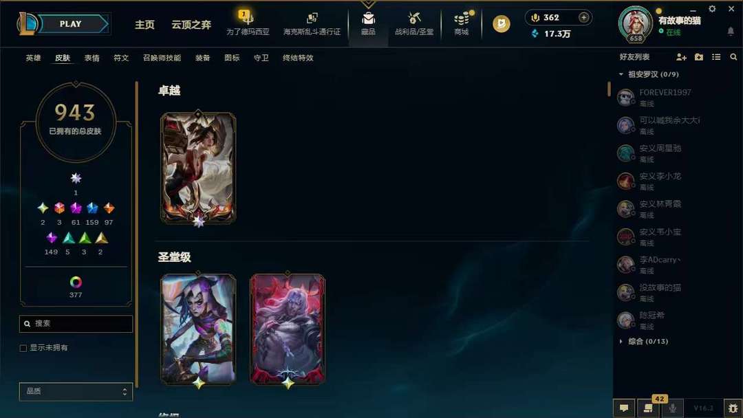 装备描述:950p❤名人堂卡莎❤圣堂金克斯❤圣堂佛耶戈❤马年全套年限❤至臻全套❤各种年限至臻