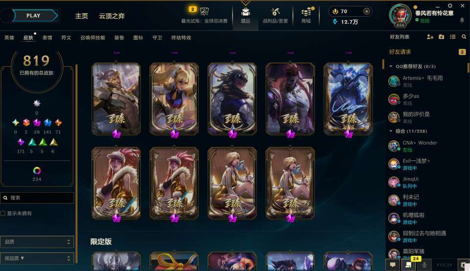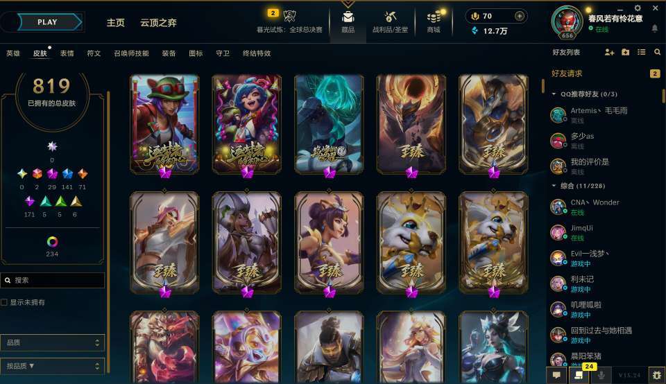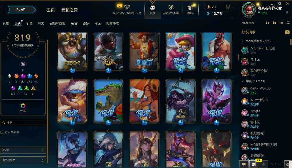 装备描述:该账号为抽奖账号,热门英雄皮肤多,高质量t2史诗多,限定多,欢迎老板体验,最后没剩几分钟不要开谢谢