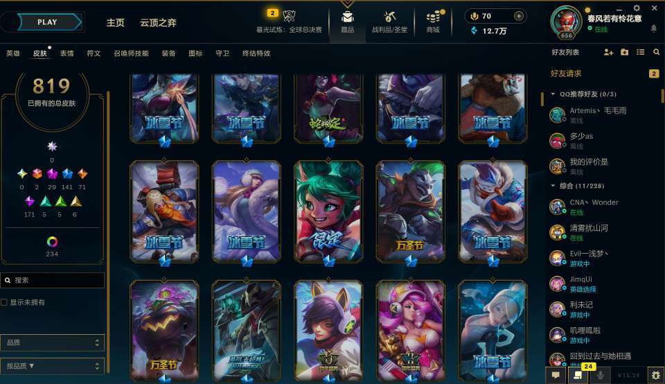850皮❤️龙瞎❤️白炫龙刀❤️至臻粉寡妇阿卡丽❤️30神话❤️多t2冰雪节❤️海克斯牛头