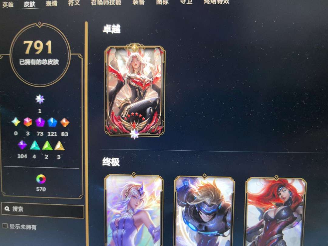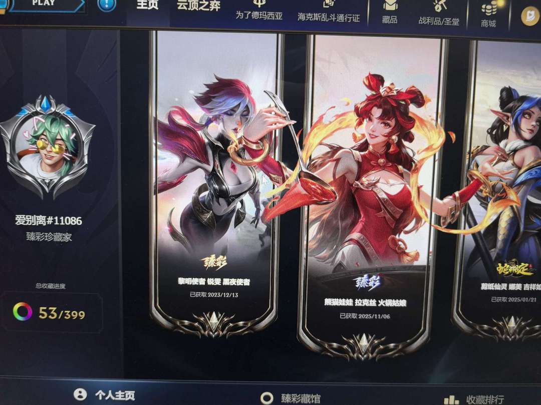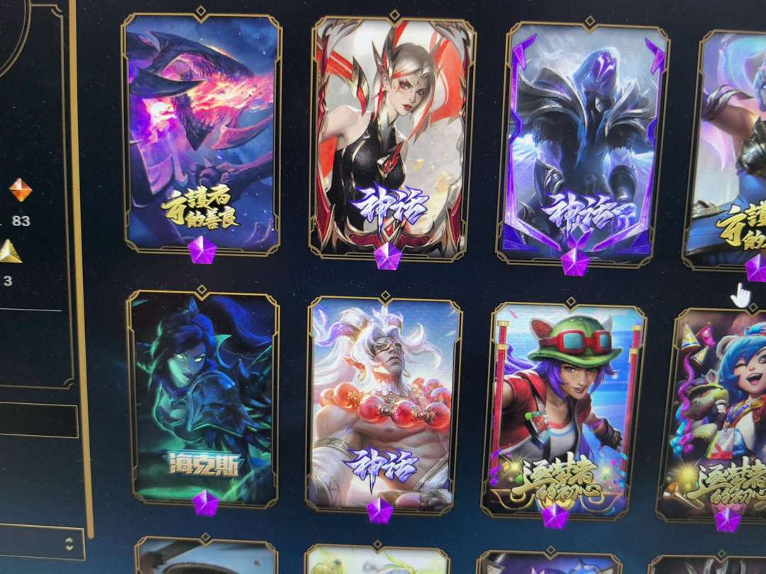 阿狸二档,三个终极皮肤,神话瞎子,诸神的黄昏蛮王,钢铁军团盖伦,臻彩53个。拉克丝棋盘和神话小小英雄