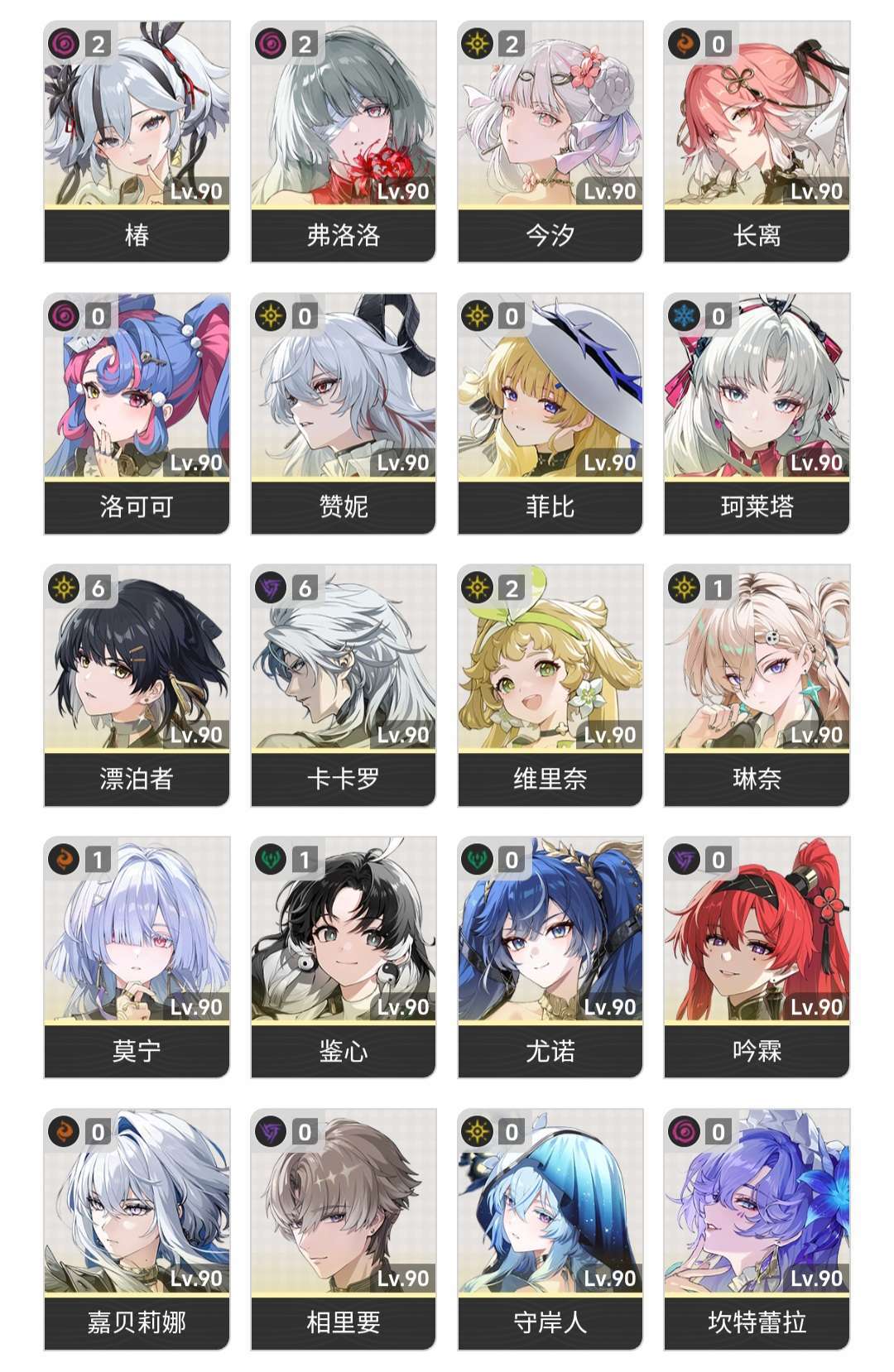 21弗汐椿,11琳奈,10莫宁,01嘉贝、珂莱塔、赞妮、洛可可、长离、吟霖、相里要,00月岸菲坎
