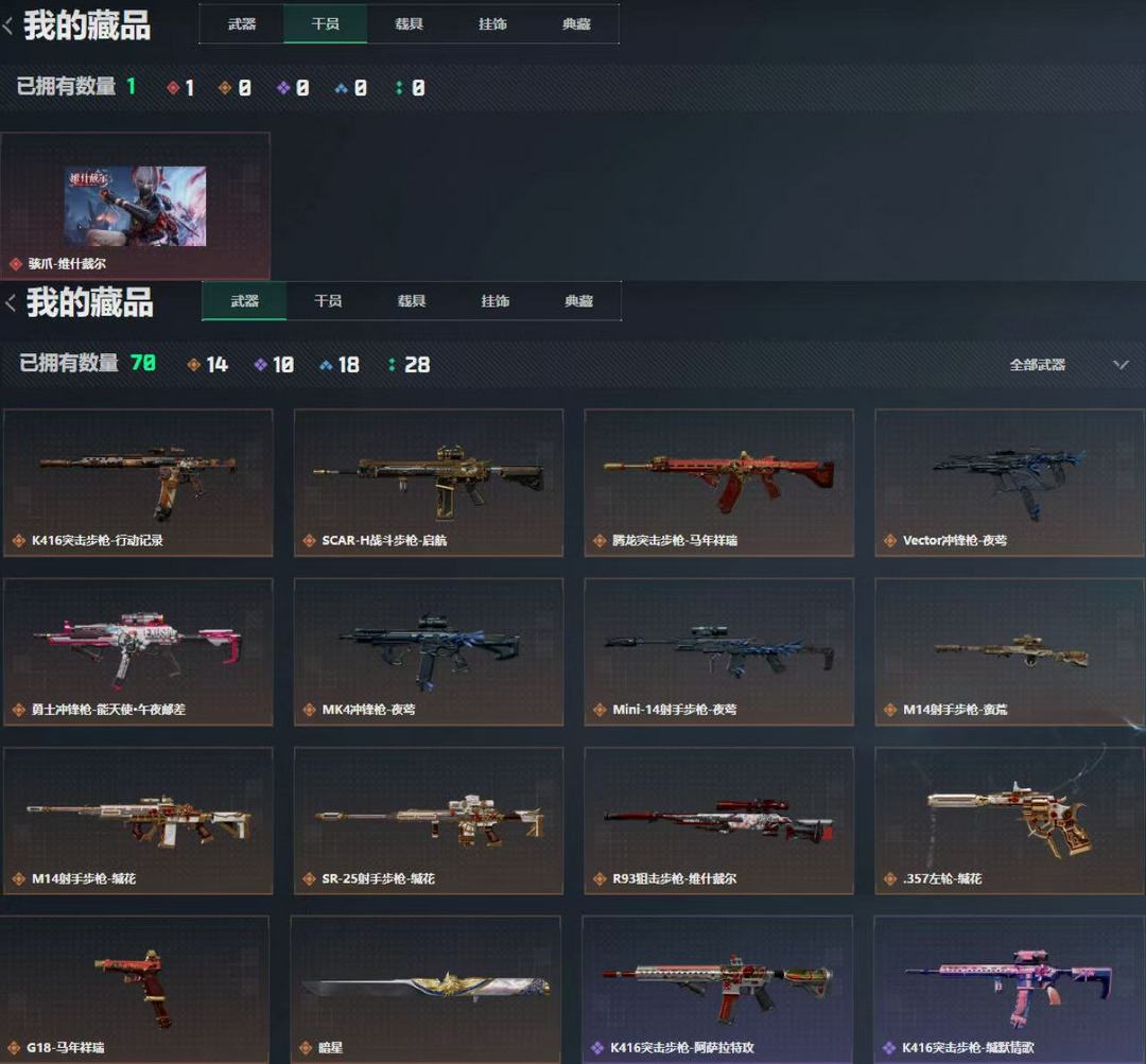 装备描述:信条刀 麦小雯红皮 骇爪 维什戴尔 14金皮 赛季6格安全箱