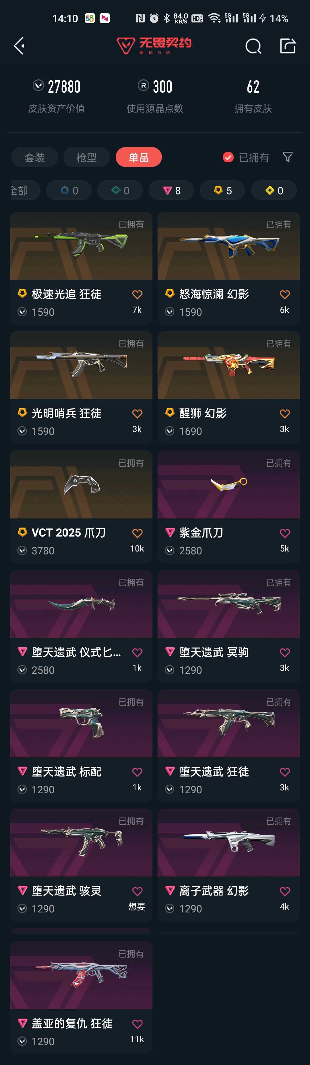 观察期VCT爪刀⭐紫金爪刀⭐堕天遗武套全⭐极速光追光明哨兵盖亚狂徒⭐离子醒狮怒海惊澜幻影⭐特效全满