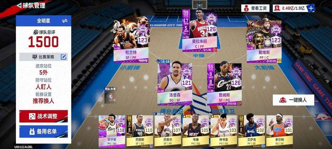 装备描述:满突大梦奥拉朱旺+天神詹+浓眉+杜兰特+汤普森,街头王朝爽玩!