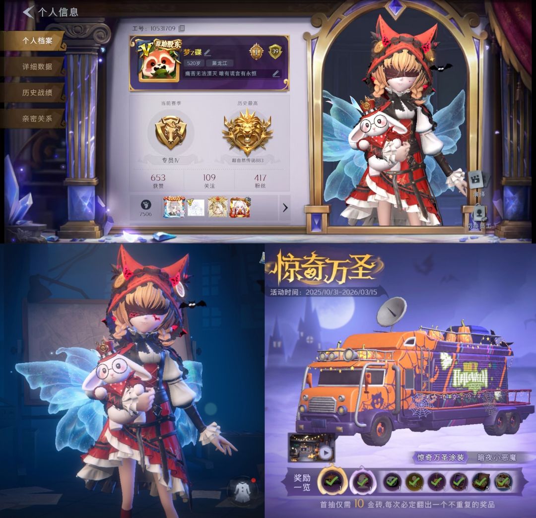 限制: 租号3次及以上 |装备描述:一单一改密,故意撤单两次拉黑!!! 全图鉴满内测全舞蹈✨万圣载具✨莓果陷阱✨莲花渡✨露比全套✨镜生遗梦✨有兔宝✨满红+满金+满紫+全魔盒