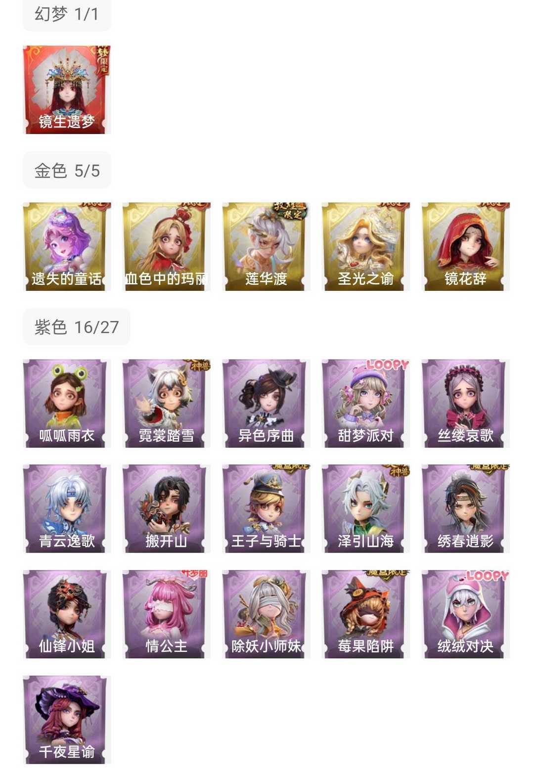 装备描述:【自带铲铲币号宝物一单一卖,每个订单结束都会上号检查铲铲币之后把宝物卖完在上架。尽量保证号都有铲铲币给大家用,请大家别浪费,铲铲币数量一单一查,发现恶意浪费和只花不赚不摸金的永久拉黑,良好的游戏体验靠大家维持,感谢大家的配合和理解,祝宝子们游戏愉快!】 【幻梦皮肤】巫铃儿-镜生遗梦 【金色皮肤】零-渡鸦公爵、逍遥-莲华渡、薇薇安-圣光之谕、爱丽丝-血色中的玛丽、小黄-遗失的童话、巫铃儿-镜花辞 【紫色皮肤】艾伦-黎明猎手、兰-千夜星谕、零-搬开山、薇薇安-仙锋小姐、爱丽丝-甜梦派对、艾伦-绒绒对决、莉莉-莓果陷阱、小黄-异色序曲、莉莉-除妖小师妹、阿念-王子与骑士、莉莉-情公主、逍遥-泽引山海、小黄-霓裳踏雪、零-青云逸歌、爱丽丝-丝缕哀歌、逍遥-绣春逍影、小黄-呱呱雨衣 【道具皮肤】喷气背包-晶澜灵翼、长鞭-缚誓之锁、额外的背包-飞花令、音响-happy猫、葫芦-伏妖塔、刺刀-赤色之刃、急救包-末章心跳、长鞭-飞天绫、短管猎枪-赞萌露比水枪、桃木剑-凤鸣九天、电击枪-甜蜜泡泡枪、转轮手枪-新星时代、音响-鸣沙鼓、腰包-私藏的银河、夜视仪-金丝眼镜、传送按钮-昆仑镜、摸金符-祝祷词、喷