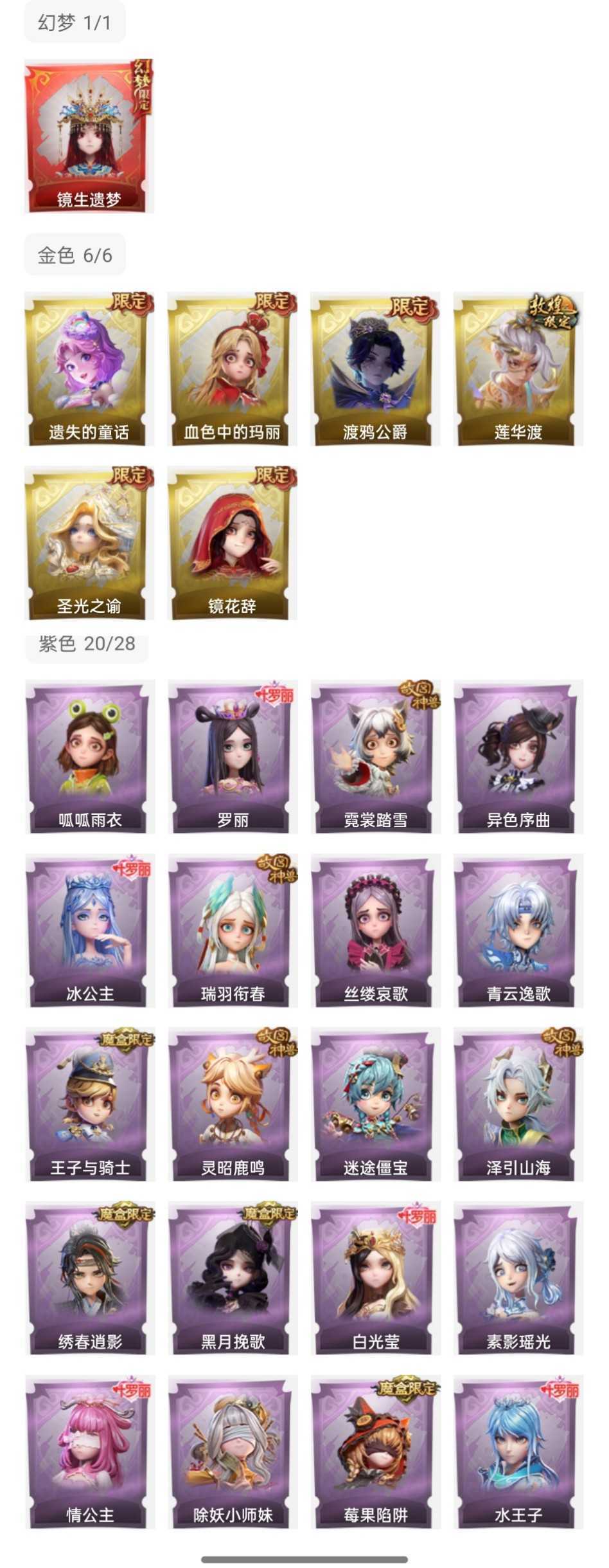 装备描述:【幻梦皮肤】巫铃儿-镜生遗梦 【金色皮肤】零-渡鸦公爵、逍遥-莲华渡、薇薇安-圣光之谕、爱丽丝-血色中的玛丽、小黄-遗失的童话、巫铃儿-镜花辞 【紫色皮肤】莉莉-莓果陷阱、小黄-异色序曲、阿念-迷途僵宝、莉莉-除妖小师妹、薇薇安-黑月挽歌、阿念-王子与骑士、莉莉-情公主、艾伦-水王子、爱丽丝-冰公主、小黄-罗丽、薇薇安-白光莹、逍遥-泽引山海、阿念-灵昭鹿鸣、爱丽丝-瑞羽衔春、小黄-霓裳踏雪、零-青云逸歌、巫铃儿-素影瑶光、爱丽丝-丝缕哀歌、逍遥-绣春逍影、小黄-呱呱雨衣 【道具皮肤】喷气背包-晶澜灵翼、夜视仪-金丝眼镜、桃木剑-凤鸣九天、传送按钮-幻宠之门、桃木剑-最后的独角兽、专业手电-云端梦想计划、额外的背包-飞花令、电击枪-甜蜜泡泡枪、音响-鸣沙鼓、刺刀-小鲨匕首、桃木剑-永眠曲、铲子-龙鳞、短管猎枪-星光的裁决、音响-happy猫、黄牛能量饮料-青玉抱丹、葫芦-伏妖塔、摸金符-花落精绝、长鞭-小狗蛇点点鞭、急救包-蔷薇物语、传送按钮-昆仑镜、铲子-卡皮巴拉小黄豚铲、摸金符-祝祷词、铲子-圣心之泪、腰包-宝剑八、刺刀-碧络琅环、转轮手枪-新星时代、喷气背包-乘风溯雪、背饰-潮汐