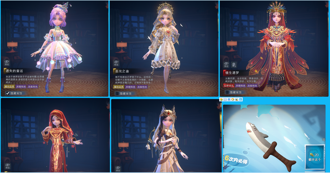 进/店选满抽镜生遗梦♥3金皮♥镜花辞♥小狗蛇小鲨匕♥3耀世♥圣光之谕♥遗失的童话