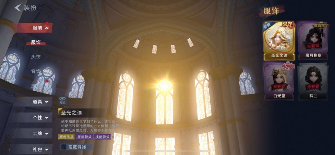 装备描述:皮肤:小黄-遗失的童话,薇薇安-圣光之谕,小黄-呱呱雨衣,小黄-霓裳踏雪,爱丽丝-瑞羽衔春,爱丽丝-丝缕哀歌,零-青云逸歌,阿念-王子与骑士,逍遥-绣春逍影,逍遥-泽引山海,薇薇安-白光莹,巫铃儿-素影瑶光,莉莉-除妖小师妹;道具:刺刀-碧络琅环,刺刀-小鲨匕首,铲子-龙鳞,铲子-圣心之泪,桃木剑-最后的独角兽,长鞭-飞天绫,长鞭-小狗蛇点点鞭,传送按钮-幻宠之门,摸金符-祝祷词,短管猎枪-星光的裁决,黄牛能量饮料-青玉抱丹,额外的背包-飞花令,音响-鸣沙鼓,音响-happy猫,转轮手枪-新星时代,急救包-蔷薇物语;饰品:头饰-惊魂南瓜头套,头饰-大葱明头套,头饰-火爆了头套,头饰-炙热烧烤,头饰-驼半仙头套,头饰-小狗蛇点点头套,头饰-鱼头怪头套,头饰-烈焰红唇头套,头饰-面具马头套,头饰-哈士奇头套,头饰-嘻嘻头套,头饰-滑稽头套,头饰-呆滞头套,头饰-卑微头套,头饰-像素朋克墨镜,背饰-绒团小狐狸,背饰-小小水王子,背饰-蝶恋花,背饰-毛球夹子,背饰-云梦之星,挂饰-糖果守卫