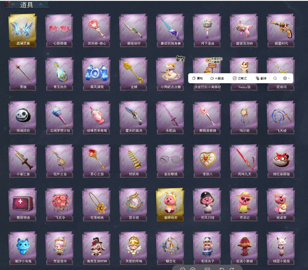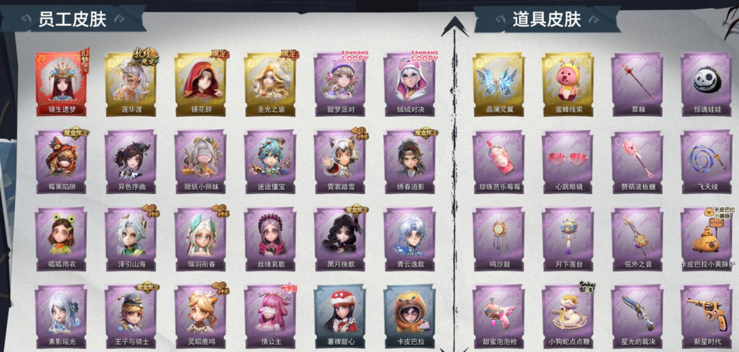 装备描述:【段位】超自然传说 【幻梦皮肤数量】1 【金色皮肤数量】3 【紫色皮肤数量】18 【道具皮肤数量】48 【累充】41080金砖 【赛季魔盒】稀世豪华魔盒 【员工】小黄、爱丽丝、零、阿念、逍遥、薇薇安、巫铃儿、莉莉、艾伦、爱德华、兰 【幻梦皮肤】巫铃儿-镜生遗梦 【金色皮肤】逍遥-莲华渡、薇薇安-圣光之谕、巫铃儿-镜花辞 【紫色皮肤】爱丽丝-甜梦派对、艾伦-绒绒对决、莉莉-莓果陷阱、小黄-异色序曲、阿念-迷途僵宝、莉莉-除妖小师妹、薇薇安-黑月挽歌、阿念-王子与骑士、莉莉-情公主、逍遥-泽引山海、阿念-灵昭鹿鸣、爱丽丝-瑞羽衔春、小黄-霓裳踏雪、零-青云逸歌、巫铃儿-素影瑶光、爱丽丝-丝缕哀歌、逍遥-绣春逍影、小黄-呱呱雨衣 【道具皮肤】喷气背包-晶澜灵翼、夜视仪-心跳眼镜、刺刀-碧络琅环、桃木剑-最后的独角兽、腰包-月下莲台、电击枪-甜蜜泡泡枪、转轮手枪-新星时代、黄牛能量饮料-青玉抱丹、喷气背包-乘风溯雪、铲子-龙鳞、长鞭-小狗蛇点点鞭、铲子-卡皮巴拉小黄豚铲、音响-happy猫、摸金符-祝祷词、腰包-惊魂娃娃、专业手电-云端梦想计划、黄牛能量饮料-珍珠芭乐莓莓、短管猎枪-星光的裁决
