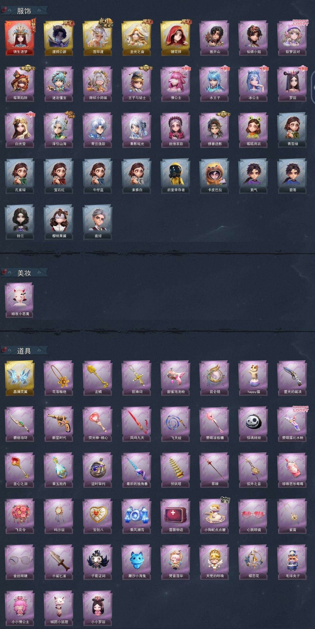 限制: 撤单率<20%才可租用此帐号装备描述:【金色皮肤】零-渡鸦公爵、逍遥-莲华渡、薇薇安-圣光之谕、巫铃儿-镜花辞 【紫色皮肤】兰-千夜星谕、零-搬开山、薇薇安-仙锋小姐、爱丽丝-甜梦派对、艾伦-绒绒对决、莉莉-莓果陷阱、小黄-异色序曲、阿念-迷途僵宝、莉莉-除妖小师妹、莉莉-情公主、薇薇安-白光莹、零-青云逸歌、巫铃儿-素影瑶光、爱丽丝-丝缕哀歌、逍遥-绣春逍影、小黄-呱呱雨衣 【道具皮肤】喷气背包-晶澜灵翼、夜视仪-金丝眼镜、摸金符-祝祷词、电击枪-甜蜜泡泡枪、铲子-龙鳞、腰包-月下莲台、转轮手枪-新星时代、黄牛能量饮料-珍珠芭乐莓莓、传送按钮-逆时审判、摸金符-紫霄、急救包-蔷薇物语、急救包-末章心跳、桃木剑-最后的独角兽、刺刀-小鲨匕首、夜视仪-心跳眼镜、铲子-圣心之泪、桃木剑-凤鸣九天、刺刀-紫气东来、刺刀-碧络琅环、葫芦-伏妖塔、传送按钮-昆仑镜、腰包-惊魂娃娃、铲子-卡皮巴拉小黄豚铲、除颤仪-弦外之音、长鞭-飞天绫、腰包-宝剑八、短管猎枪-赞萌露比水枪、桃木剑-绯色遗证、额外的背包-飞花令、音响-happy猫、音响-鸣沙鼓、长鞭-小狗蛇点点鞭、黄牛能量饮料-青玉抱丹、铲子-赞萌波板糖、背饰-子夜证词、背饰-蜜蜂线