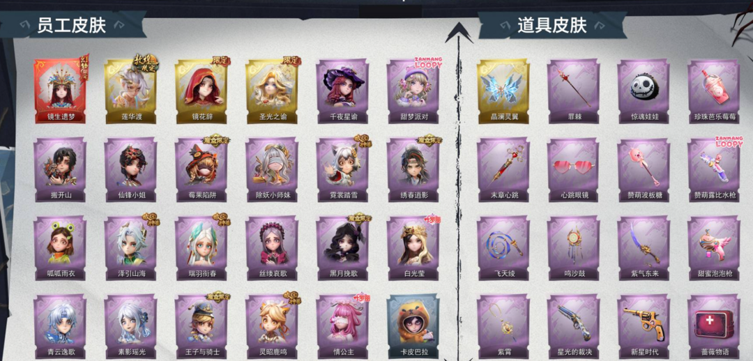 装备描述:【段位】超自然传说 【幻梦皮肤数量】1 【金色皮肤数量】3 【紫色皮肤数量】19 【道具皮肤数量】39 【累充】39050金砖 【赛季魔盒】普通魔盒 【员工】小黄、爱丽丝、零、阿念、逍遥、薇薇安、巫铃儿、莉莉、艾伦、爱德华、兰、小满 【幻梦皮肤】巫铃儿-镜生遗梦 【金色皮肤】逍遥-莲华渡、薇薇安-圣光之谕、巫铃儿-镜花辞 【紫色皮肤】兰-千夜星谕、零-搬开山、薇薇安-仙锋小姐、爱丽丝-甜梦派对、莉莉-莓果陷阱、莉莉-除妖小师妹、薇薇安-黑月挽歌、阿念-王子与骑士、莉莉-情公主、薇薇安-白光莹、逍遥-泽引山海、阿念-灵昭鹿鸣、爱丽丝-瑞羽衔春、小黄-霓裳踏雪、零-青云逸歌、巫铃儿-素影瑶光、爱丽丝-丝缕哀歌、逍遥-绣春逍影、小黄-呱呱雨衣 【道具皮肤】喷气背包-晶澜灵翼、夜视仪-心跳眼镜、转轮手枪-新星时代、葫芦-伏妖塔、摸金符-花落精绝、刺刀-小鲨匕首、传送按钮-昆仑镜、短管猎枪-星光的裁决、喷气背包-乘风溯雪、桃木剑-永眠曲、铲子-赞萌波板糖、传送按钮-幻宠之门、音响-鸣沙鼓、短管猎枪-赞萌露比水枪、摸金符-紫霄、夜视仪-金丝眼镜、长鞭-飞天绫、急救包-蔷薇物语、黄牛能量饮料-珍珠芭