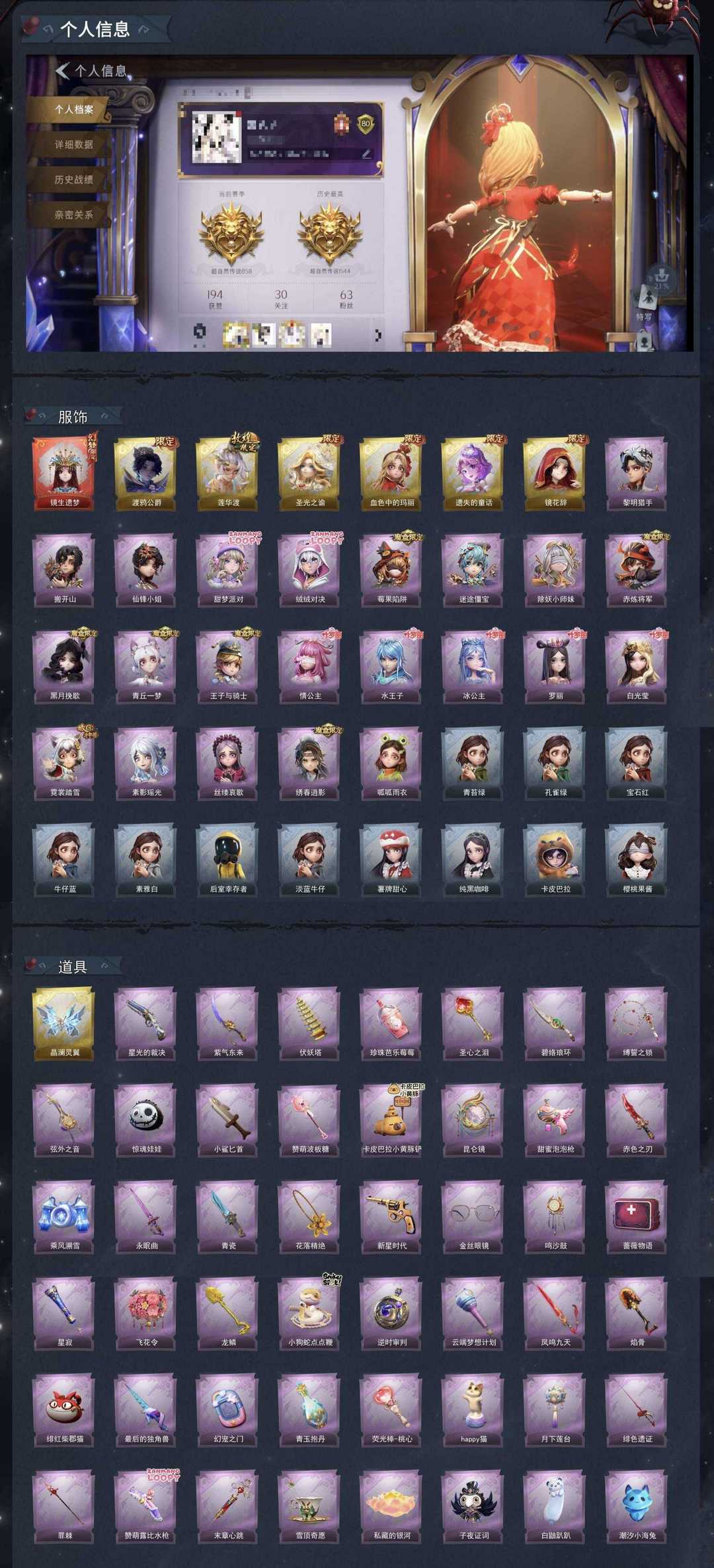 限制: 撤单率<30%才可租用此帐号装备描述:!已设置二级密码,无法出售金色回收物,定期会往号上补充铲铲币,但不保证每一单币都充足,如果币不够用可以自行送装备,或者把金回收物给队友让队友买装备,介意勿下单。 安卓ios均可登录,恶意撤单、改id、恶意动藏品柜、恶意发言、恶意乱用金砖等不文明行为永久拉黑。 禁止使用外挂、恶意发言、用号行骗,若因此类行为导致禁言、封号的,平台提取租客实名地址,必定会立案追责,并根据账号价值全额赔偿。 一单一密保证中途不会挤号,喜欢可点☆收藏☆方便下次租用,祝板板们游戏愉快~ 账号情况现如下: 瑶台梦⭐晶澜灵翼⭐镜生遗梦池抽满⭐渡鸦公爵池抽满⭐️莲华渡⭐️血色中的玛丽 6金皮:遗失的童话/圣光之谕/莲华渡/镜花辞/渡鸦公爵/血色中的玛丽 s1-s7魔盒:青丘一梦 赤练将军 黑月挽歌 王子与骑士 绣春逍影 莓果陷阱 黎明猎手 故宫:霓裳踏雪 青花瓷:素影瑶光 叶罗丽:情公主 冰公主 水王子 罗丽 白光莹 捉妖奇妙夜:迷途僵宝 除妖小师妹 露比联动时装:绒绒对决 甜梦派对 非遗傩戏:搬开山 先锋小姐 呱呱雨衣/丝缕哀歌/千夜星渝/赞萌露比水枪/鲨鱼匕首/小狗蛇点点鞭/卡皮巴拉/赞萌露比背饰/彩虹腰包