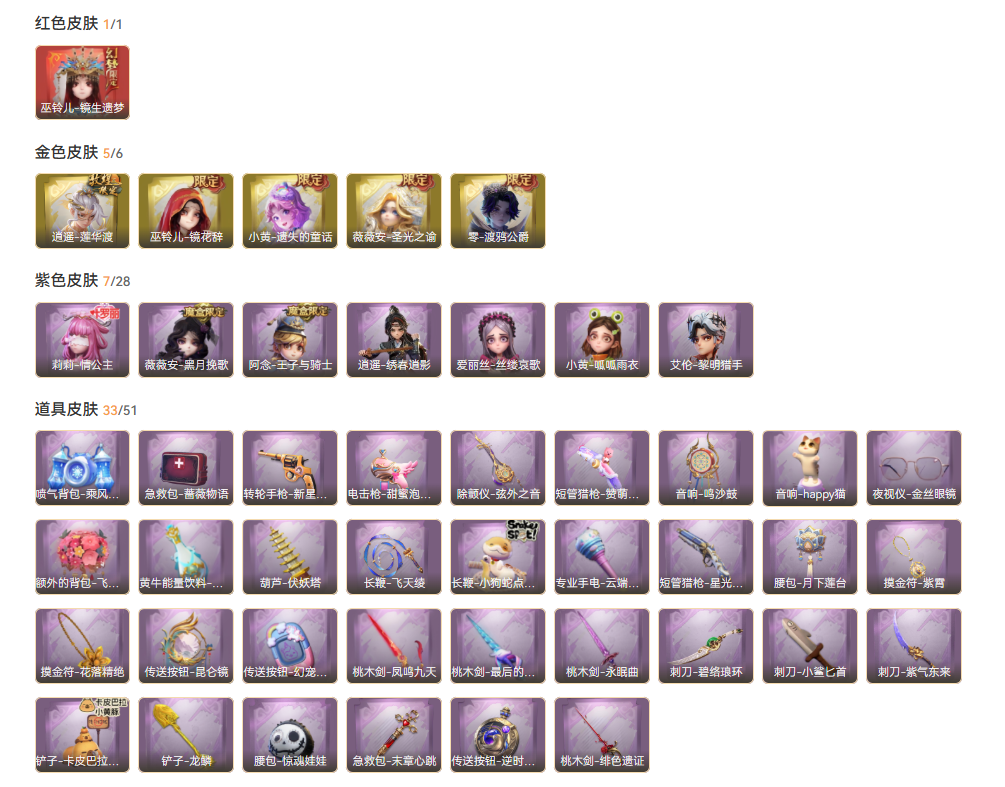 装备描述:巫铃儿-镜生遗梦,巫铃儿-镜花辞,零-渡鸦公爵,薇薇安-圣光之谕,逍遥-莲华渡,小黄-遗失的童话,薇薇安-黑月挽歌,逍遥-绣春逍影,小黄-呱呱雨衣,阿念-王子与骑士,艾伦-黎明猎手,莉莉-情公主,爱丽丝-丝缕哀歌;道具:铲子-卡皮巴拉小黄豚铲,专业手电-云端梦想计划,传送按钮-幻宠之门,葫芦-伏妖塔,喷气背包-乘风溯雪,桃木剑-凤鸣九天,桃木剑-最后的独角兽,刺刀-小鲨匕首,音响-鸣沙鼓,长鞭-小狗蛇点点鞭,腰包-惊魂娃娃,传送按钮-昆仑镜,短管猎枪-赞萌露比水枪,短管猎枪-星光的裁决,铲子-龙鳞,腰包-月下莲台,刺刀-紫气东来,黄牛能量饮料-青玉抱丹,摸金符-花落精绝,音响-happy猫,除颤仪-弦外之音,夜视仪-金丝眼镜,长鞭-飞天绫,传送按钮-逆时审判,摸金符-紫霄,电击枪-甜蜜泡泡枪,急救包-蔷薇物语,额外的背包-飞花令,急救包-末章心跳,桃木剑-永眠曲,转轮手枪-新星时代,桃木剑-绯色遗证,刺刀-碧络琅环;美妆:美妆-暗夜小恶魔;饰品:头饰-大葱明头套,头饰-炙热烧烤,头饰-烈焰红唇头套,头饰-卑微头套,头饰-小狗蛇点点头套,头饰-呆滞头套,头饰-雪墩墩头套,头饰-驼半仙头套