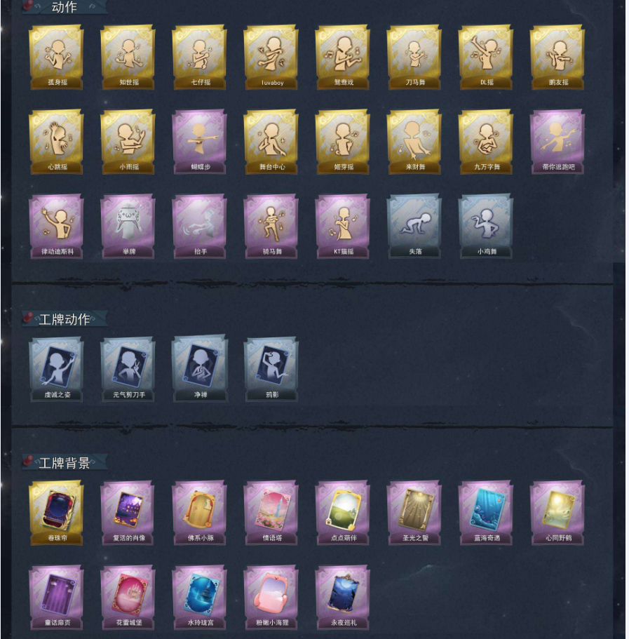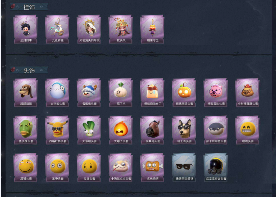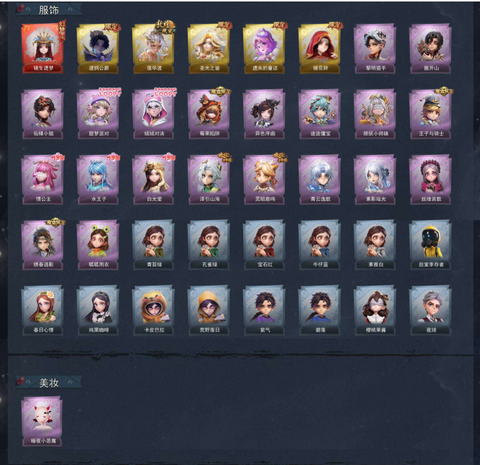 装备描述:【幻梦皮肤】巫铃儿-镜生遗梦 【金色皮肤】零-渡鸦公爵、逍遥-莲华渡、薇薇安-圣光之谕、小黄-遗失的童话、巫铃儿-镜花辞 【紫色皮肤】艾伦-黎明猎手、零-搬开山、薇薇安-仙锋小姐、爱丽丝-甜梦派对、艾伦-绒绒对决、莉莉-莓果陷阱、小黄-异色序曲、阿念-迷途僵宝、莉莉-除妖小师妹、阿念-王子与骑士、莉莉-情公主、艾伦-水王子、薇薇安-白光莹、逍遥-泽引山海、阿念-灵昭鹿鸣、零-青云逸歌、巫铃儿-素影瑶光、爱丽丝-丝缕哀歌、逍遥-绣春逍影、小黄-呱呱雨衣 【道具皮肤】喷气背包-晶澜灵翼、音响-happy猫、黄牛能量饮料-珍珠芭乐莓莓、传送按钮-昆仑镜、夜视仪-金丝眼镜、摸金符-祝祷词、铲子-龙鳞、短管猎枪-星光的裁决、黄牛能量饮料-雪顶奇愿、急救包-蔷薇物语、腰包-月下莲台、铲子-圣心之泪、专业手电-星寂、长鞭-小狗蛇点点鞭、葫芦-伏妖塔、长鞭-缚誓之锁、喷气背包-乘风溯雪、电击枪-甜蜜泡泡枪、除颤仪-弦外之音、传送按钮-逆时审判、音响-鸣沙鼓、转轮手枪-新星时代、黄牛能量饮料-青玉抱丹、刺刀-紫气东来、急救包-末章心跳、夜视仪-心跳眼镜、摸金符-紫霄、刺刀-碧络琅环、长鞭-飞天绫、短管猎