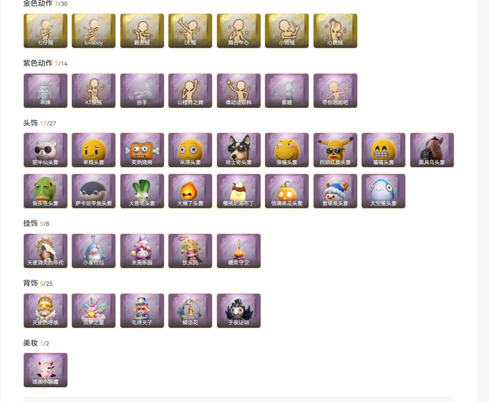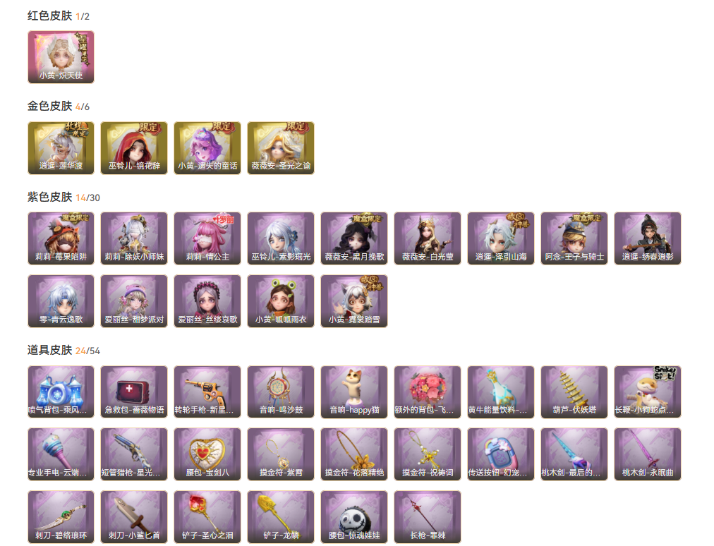 装备描述:皮肤:小黄-炽天使,逍遥-莲华渡,巫铃儿-镜花辞,薇薇安-圣光之谕,小黄-遗失的童话,莉莉-情公主,阿念-王子与骑士,莉莉-莓果陷阱,薇薇安-黑月挽歌,薇薇安-白光莹,小黄-霓裳踏雪,巫铃儿-素影瑶光,逍遥-泽引山海,小黄-呱呱雨衣,莉莉-除妖小师妹,逍遥-绣春逍影,零-青云逸歌,爱丽丝-丝缕哀歌,爱丽丝-甜梦派对;道具:闪光弹-金戈玄铜,黄牛能量饮料-青玉抱丹,桃木剑-最后的独角兽,腰包-宝剑八,专业手电-云端梦想计划,额外的背包-飞花令,桃木剑-永眠曲,传送按钮-幻宠之门,长鞭-小狗蛇点点鞭,腰包-惊魂娃娃,刺刀-小鲨匕首,急救包-蔷薇物语,摸金符-紫霄,音响-happy猫,摸金符-祝祷词,短管猎枪-星光的裁决,葫芦-伏妖塔,转轮手枪-新星时代,音响-鸣沙鼓,刺刀-碧络琅环,长枪-罪棘,摸金符-花落精绝,铲子-龙鳞,喷气背包-乘风溯雪,铲子-圣心之泪;美妆:美妆-暗夜小恶魔;饰品:头饰-呆滞头套,头饰-烈焰红唇头套,头饰-萨卡班甲鱼头套,头饰-哈士奇头套,头饰-面具马头套,头饰-樱桃奶油布丁,头饰-太空鲨头套,头饰-炙热烧烤,头饰-卑微头套,头饰-嘻嘻头套,头饰-惊魂南瓜头套,头饰