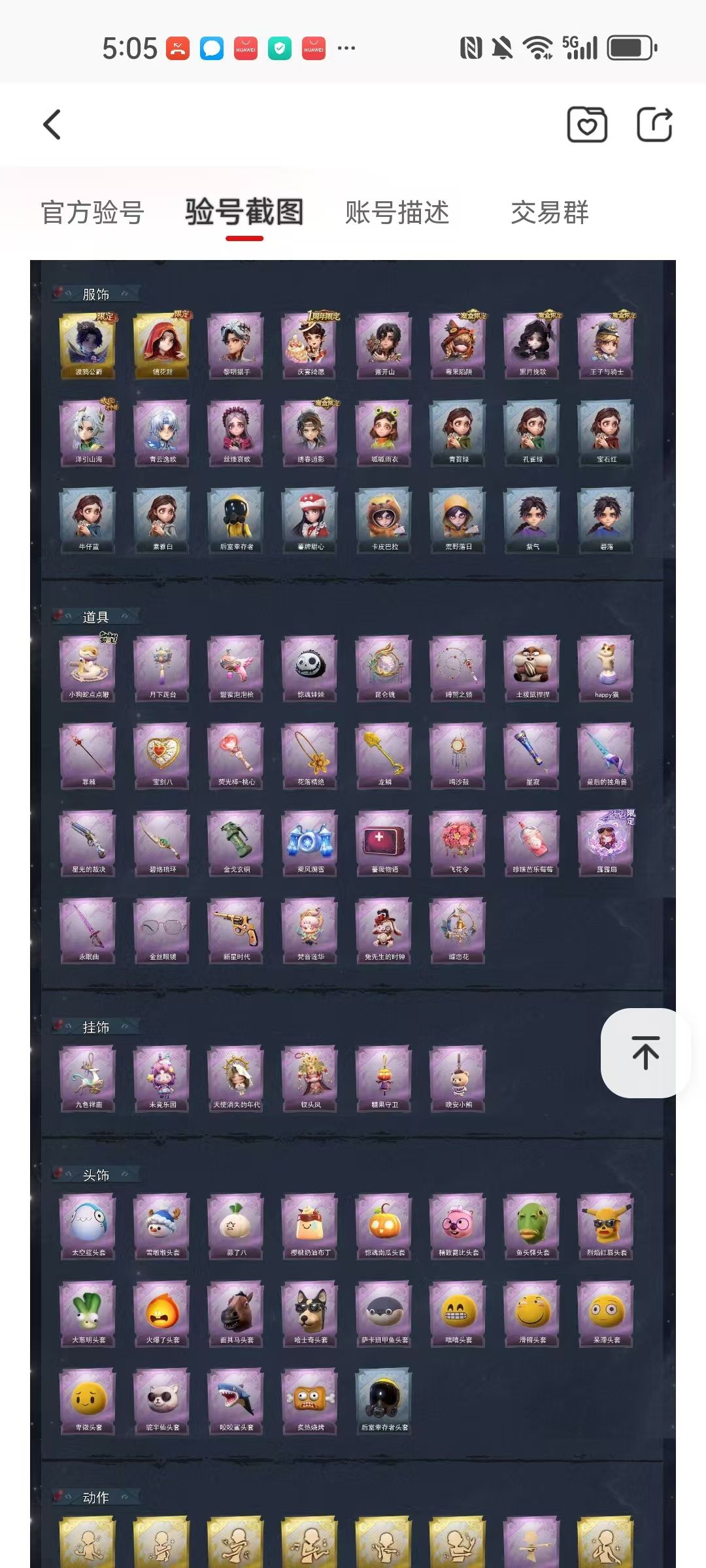 装备描述:【金色皮肤】零-渡鸦公爵、巫铃儿-镜花辞 【紫色皮肤】艾伦-黎明猎手、阿念-庆宴绮愿、零-搬开山、莉莉-莓果陷阱、薇薇安-黑月挽歌、阿念-王子与骑士、逍遥-泽引山海、零-青云逸歌、爱丽丝-丝缕哀歌、逍遥-绣春逍影、小黄-呱呱雨衣 【道具皮肤】长鞭-小狗蛇点点鞭、腰包-月下莲台、电击枪-甜蜜泡泡枪、腰包-惊魂娃娃、传送按钮-昆仑镜、长鞭-缚誓之锁、急救包-土拨鼠捏捏、音响-happy猫、腰包-宝剑八、摸金符-花落精绝、铲子-龙鳞、音响-鸣沙鼓、专业手电-星寂、桃木剑-最后的独角兽、短管猎枪-星光的裁决、刺刀-碧络琅环、闪光弹-金戈玄铜、喷气背包-乘风溯雪、急救包-蔷薇物语、额外的背包-飞花令、黄牛能量饮料-珍珠芭乐莓莓、折扇-露露扇、桃木剑-永眠曲、夜视仪-金丝眼镜、转轮手枪-新星时代、背饰-梵音莲华、背饰-兔先生的时钟、背饰-蝶恋花 【头饰】太空鲨头套、雪墩墩头套、蒜了八、樱桃奶油布丁、惊魂南瓜头套、精致露比头套、鱼头怪头套、烈焰红唇头套、大葱明头套、火爆了头套、面具马头套、哈士奇头套、萨卡班甲鱼头套、嘻嘻头套、滑稽头套、呆滞头套、卑微头套、驼半仙头套、咬咬鲨头套、炙热烧烤、后室幸存者