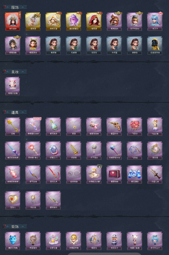 装备描述:巫铃儿-镜生遗梦 【金色皮肤】逍遥-莲华渡、薇薇安-圣光之谕、小黄-遗失的童话、巫铃儿-镜花辞 【紫色皮肤】莉莉-莓果陷阱、阿念-王子与骑士、艾伦-水王子、逍遥-绣春逍影、小黄-呱呱雨衣 【道具皮肤】铲子-龙鳞、短管猎枪-赞萌露比水枪、黄牛能量饮料-青玉抱丹、摸金符-紫霄、电击枪-甜蜜泡泡枪、转轮手枪-新星时代、额外的背包-飞花令、音响-happy猫、桃木剑-最后的独角兽、传送按钮-幻宠之门、葫芦-伏妖塔、腰包-月下莲台、专业手电-云端梦想计划、长鞭-飞天绫、传送按钮-昆仑镜、黄牛能量饮料-珍珠芭乐莓莓、刺刀-紫气东来、桃木剑-凤鸣九天、夜视仪-金丝眼镜、长鞭-小狗蛇点点鞭、急救包-蔷薇物语、喷气背包-乘风溯雪、刺刀-小鲨匕首、腰包-宝剑八、音响-鸣沙鼓、刺刀-碧络琅环 【美妆】暗夜小恶魔 【载具】惊奇万圣涂装 【头饰】精致露比头套、小财神豚豚头套、鱼头怪头套、烈焰红唇头套、大葱明头套、火爆了头套、面具马头套、哈士奇头套、萨卡班甲鱼头套、嘻嘻头套、滑稽头套、呆滞头套、卑微头套、像素朋克墨镜、后室幸存者头套 【背饰】潮汐小海兔、梵音莲华、云梦之星、天使的呼唤、蝶恋花、毛球夹子、绒团小狐狸