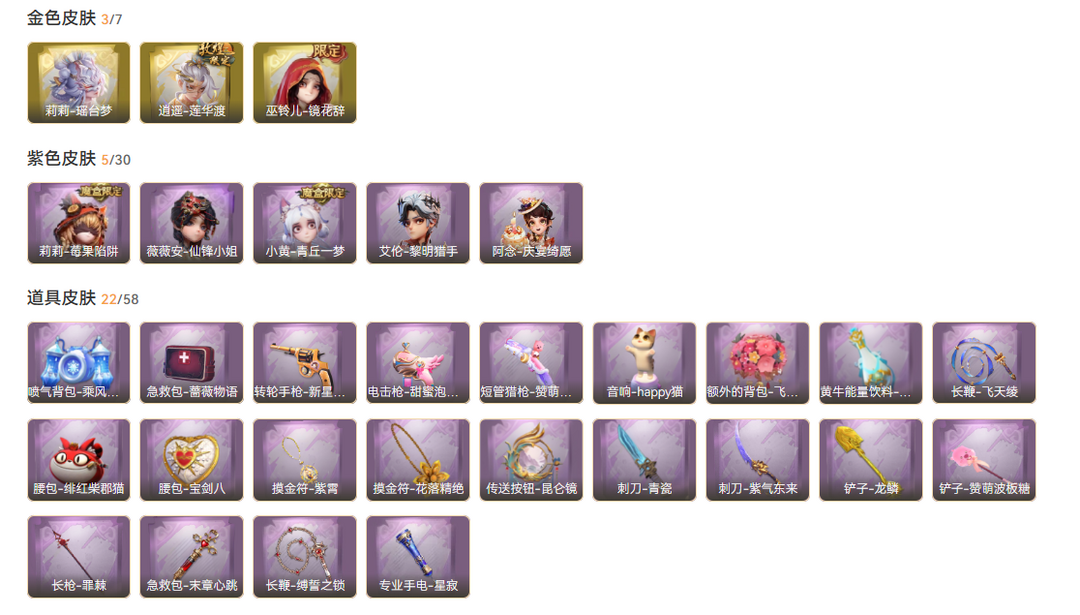 装备描述:兔宝2月16号到期 皮肤:巫铃儿-镜花辞,逍遥-莲华渡,莉莉-瑶台梦,莉莉-莓果陷阱,艾伦-黎明猎手,薇薇安-仙锋小姐,小黄-青丘一梦,阿念-庆宴绮愿;道具:转轮手枪-新星时代,摸金符-紫霄,音响-happy猫,闪光弹-金戈玄铜,电击枪-甜蜜泡泡枪,腰包-绯红柴郡猫,长枪-罪棘,额外的背包-飞花令,急救包-蔷薇物语,黄牛能量饮料-青玉抱丹,铲子-赞萌波板糖,腰包-宝剑八,铲子-龙鳞,传送按钮-昆仑镜,摸金符-花落精绝,喷气背包-乘风溯雪,长鞭-缚誓之锁,专业手电-星寂,刺刀-紫气东来,刺刀-青瓷,急救包-末章心跳,长鞭-飞天绫,短管猎枪-赞萌露比水枪;饰品:头饰-呆滞头套,头饰-惊魂南瓜头套,头饰-哈士奇头套,头饰-面具马头套,头饰-萨卡班甲鱼头套,头饰-蒜了八,头饰-太空鲨头套,头饰-卑微头套,头饰-樱桃奶油布丁,头饰-嘻嘻头套,头饰-鱼头怪头套,头饰-小狗蛇点点头套,头饰-精致露比头套,头饰-,头饰-烈焰红唇头套,头饰-雪墩墩头套,头饰-滑稽头套,头饰-呆呆鸭头套,头饰-伤心蛙头套,头饰-像素朋克墨镜,头饰-后室幸存者头套,挂饰-尘封旧事,挂饰-小鲨包包,挂饰-九色祥鹿,挂