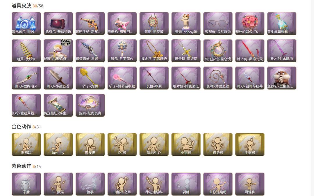 装备描述:皮肤:小黄-炽天使,巫铃儿-镜生遗梦,巫铃儿-镜花辞,逍遥-莲华渡,爱丽丝-冰公主,莉莉-莓果陷阱,莉莉-情公主,巫铃儿-素影瑶光,艾伦-黎明猎手,零-青云逸歌,薇薇安-黑月挽歌,小黄-呱呱雨衣,小黄-霓裳踏雪,阿念-王子与骑士,艾伦-绒绒对决,莉莉-除妖小师妹,逍遥-绣春逍影,爱丽丝-甜梦派对,爱丽丝-丝缕哀歌,阿念-迷途僵宝,爱丽丝-瑞羽衔春,零-搬开山,逍遥-泽引山海,阿念-灵昭鹿鸣,爱丽丝-耀眼的你,薇薇安-仙锋小姐;道具:夜视仪-金丝眼镜,急救包-土拨鼠捏捏,长鞭-小狗蛇点点鞭,传送按钮-浮生一梦,摸金符-祝祷词,闪光弹-金戈玄铜,音响-鸣沙鼓,急救包-蔷薇物语,刺刀-小鲨匕首,喷气背包-乘风溯雪,铲子-赞萌波板糖,黄牛能量饮料-青玉抱丹,长枪-糖葫芦霸王枪,葫芦-伏妖塔,铲子-龙鳞,桃木剑-绯色遗证,桃木剑-永眠曲,长鞭-缚誓之锁,折扇-赴此良宵,电击枪-甜蜜泡泡枪,腰包-月下莲台,摸金符-花落精绝,刺刀-铂刺与红萼,刺刀-碧络琅环,转轮手枪-新星时代,长枪-罪棘,短管猎枪-星光的裁决,桃木剑-凤鸣九天,额外的背包-飞花令,音响-happy猫,传送按钮-昆仑镜;美妆:美妆-