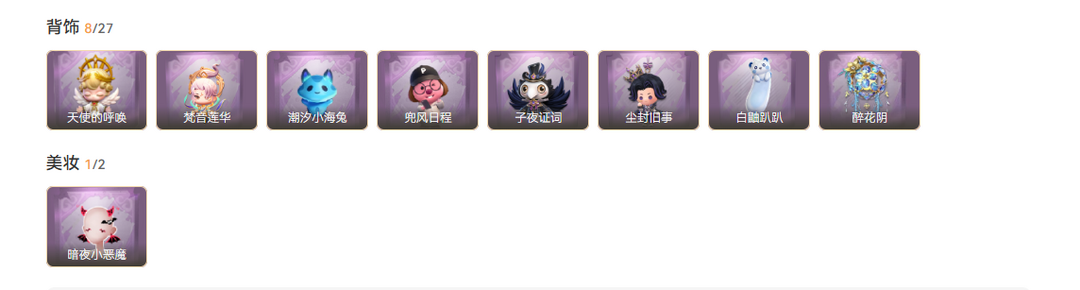 装备描述:皮肤:逍遥-莲华渡,巫铃儿-镜花辞,小黄-遗失的童话,零-渡鸦公爵,莉莉-瑶台梦,莉莉-莓果陷阱,零-搬开山,阿念-庆宴绮愿,艾伦-绒绒对决,莉莉-情公主,小黄-呱呱雨衣,零-青云逸歌,艾伦-黎明猎手,逍遥-泽引山海,阿念-王子与骑士;道具:葫芦-伏妖塔,音响-happy猫,闪光弹-金戈玄铜,长鞭-缚誓之锁,摸金符-紫霄,铲子-龙鳞,转轮手枪-新星时代,黄牛能量饮料-珍珠芭乐莓莓,桃木剑-绯色遗证,喷气背包-乘风溯雪,腰包-月下莲台,夜视仪-花容,夜视仪-金丝眼镜,急救包-蔷薇物语,音响-鸣沙鼓,短管猎枪-星光的裁决,额外的背包-飞花令,腰包-惊魂娃娃,黄牛能量饮料-青玉抱丹,腰包-宝剑八,传送按钮-逆时审判,长鞭-飞天绫,电击枪-甜蜜泡泡枪,长枪-罪棘,急救包-土拨鼠捏捏;美妆:美妆-暗夜小恶魔;饰品:头饰-滑稽头套,头饰-萨卡班甲鱼头套,头饰-哈士奇头套,头饰-精致露比头套,头饰-卑微头套,头饰,头饰-樱桃奶油布丁,头饰-嘻嘻头套,头饰-雪墩墩头套,头饰-惊魂南瓜头套,头饰-烈焰红唇头套,头饰-太空鲨头套,头饰-火爆了头套,头饰-炙热烧烤,头饰-蒜了八,头饰-面具马头套,