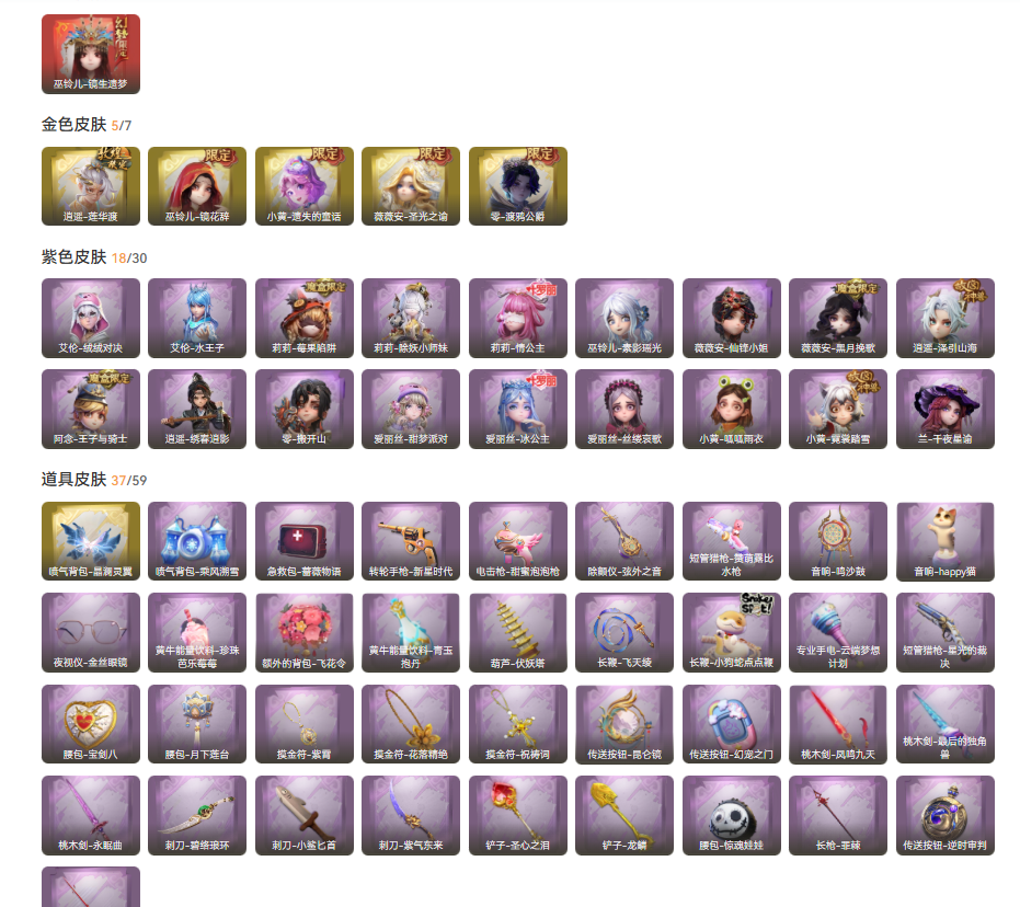 装备描述:1红5金18紫37道具皮晶澜灵翼镜生遗梦镜花辞莲花渡渡鸦公爵遗失的童话圣光之谕/莓果陷阱情公主泽引山