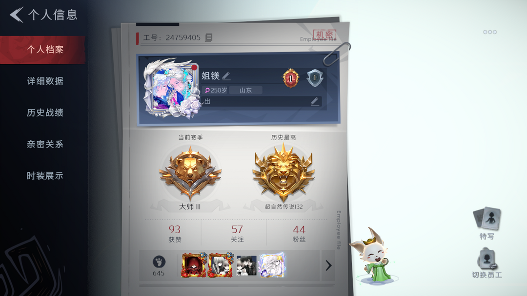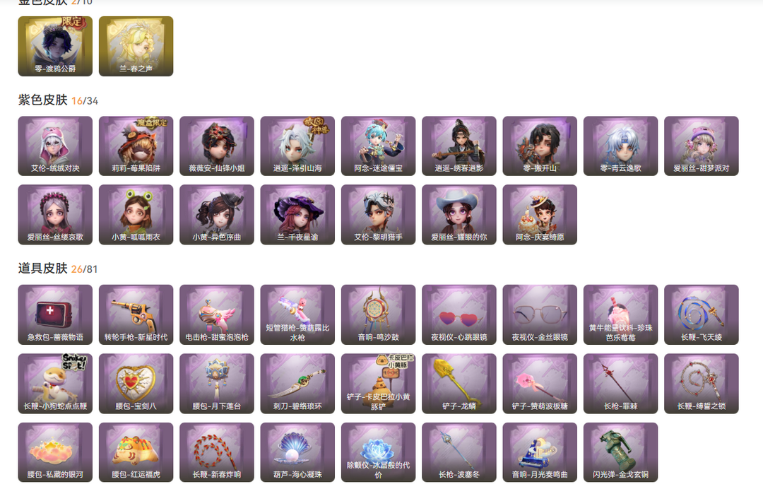 装备描述:金皮2;紫皮16;道具皮27;皮肤:兰-春之声,零-渡鸦公爵,艾伦-绒绒对决,爱丽丝-耀眼的你,艾伦-黎明猎手,阿念-迷途僵宝,阿念-庆宴绮愿,莉莉-莓果陷阱,小黄-呱呱雨衣,薇薇安-仙锋小姐,逍遥-泽引山海,逍遥-绣春逍影,零-搬开山,兰-千夜星谕,小黄-异色序曲,零-青云逸歌,爱丽丝-丝缕哀歌,爱丽丝-甜梦派对;道具:音响-月光奏鸣曲,刺刀-碧络琅环,短管猎枪-赞萌露比水枪,长鞭-新春炸响,黄牛能量饮料-珍珠芭乐莓莓,闪光弹-金戈玄铜,长枪-波塞冬,夜视仪-金丝眼镜,长鞭-小狗蛇点点鞭,腰包-私藏的银河,夜视仪-心跳眼镜,急救包-蔷薇物语,电击枪-甜蜜泡泡枪,长鞭-飞天绫,长鞭-缚誓之锁,铲子-龙鳞,腰包-宝剑八,铲子-卡皮巴拉小黄豚铲,除颤仪-冰晶般的代价,腰包-红运福虎,音响-鸣沙鼓,长枪-罪棘,葫芦-海心凝珠,转轮手枪-新星时代,铲子-赞萌波板糖,腰包-月下莲台,伞-伞;美妆:美妆-萌兔气泡;饰品:头饰-雪墩墩头套,头饰-惊魂南瓜头套,头饰-马上有钱,头饰-面具马头套,头饰-樱桃奶油布丁,头饰-烛光,头饰-滑稽头套,头饰-蒜了八,头饰-呆滞头套,头饰-饺饺者头套,头饰-卑
