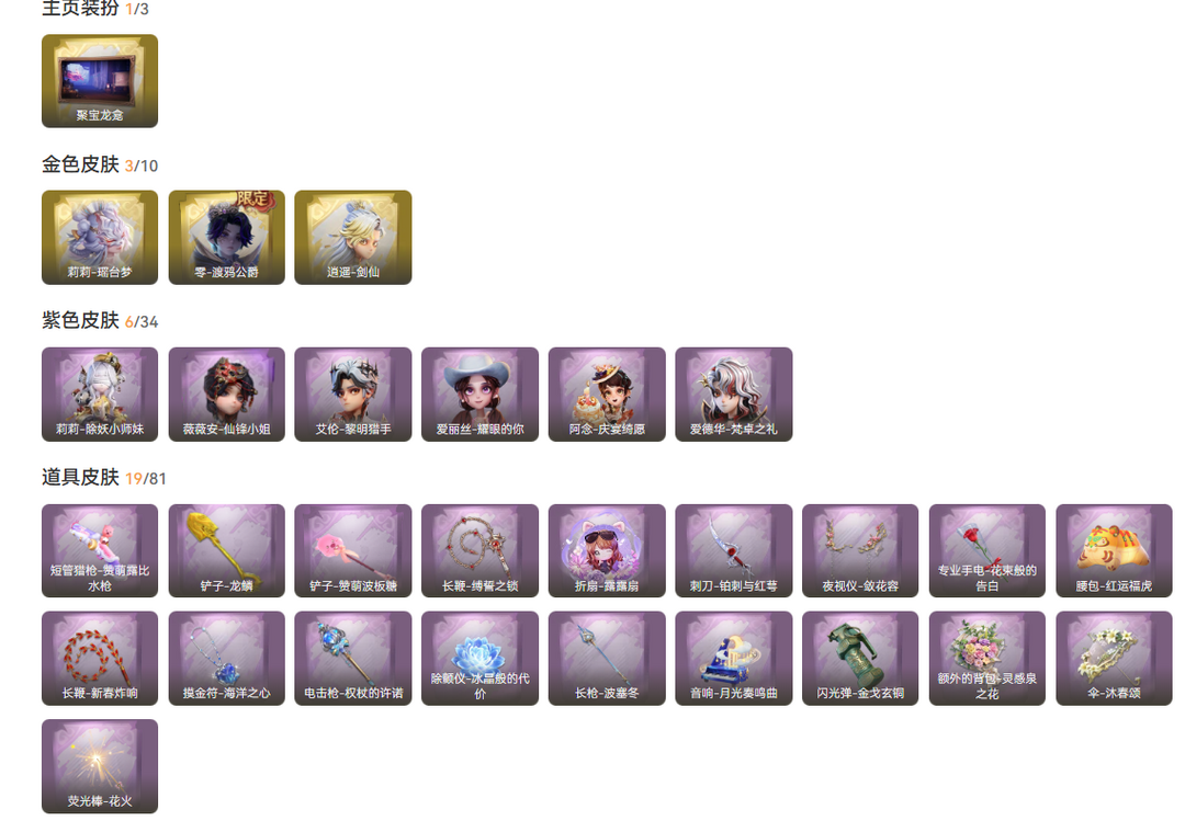 装备描述:金皮3;紫皮6;道具皮21;皮肤:零-渡鸦公爵,逍遥-剑仙,莉莉-瑶台梦,莉莉-除妖小师妹,爱德华-梵卓之礼,艾伦-黎明猎手,爱丽丝-耀眼的你,阿念-庆宴绮愿,薇薇安-仙锋小姐;道具:专业手电-花束般的告白,夜视仪-花容,折扇-露露扇,荧光棒-花火-荧光棒-花火,黄牛能量饮料-无人岸,短管猎枪-赞萌露比水枪,音响-月光奏鸣曲,长枪-波塞冬,除颤仪-冰晶般的代价,摸金符-海洋之心,长鞭-新春炸响,腰包-红运福虎,铲子-龙鳞,额外的背包-灵感泉之花,长鞭-缚誓之锁,刺刀-铂刺与红萼,黄牛能量饮料-星空特调,电击枪-权杖的许诺,闪光弹-金戈玄铜,伞-沐春颂,铲子-赞萌波板糖;美妆:美妆-萌兔气泡;饰品:头饰-马上有钱,头饰-纪念,头饰-哈士奇头套,头饰-饺饺者头套,头饰-鱼头怪头套,头饰-滑稽头套,头饰-腊肠扭扭,头饰-烈焰红唇头套,头饰-萨卡班甲鱼头套,头饰-卑微头套,头饰-呆滞头套,头饰-蒜了八,头饰-嘻嘻头套,头饰-面具马头套,头饰-像素朋克墨镜,头饰-后室幸存者头套,挂饰-拂云仙,挂饰-桂冠聆诗,挂饰-糖果守卫,挂饰-九色祥鹿,挂饰-尘封旧事,挂饰-孤独对望,挂饰-不朽的今夜,背饰-