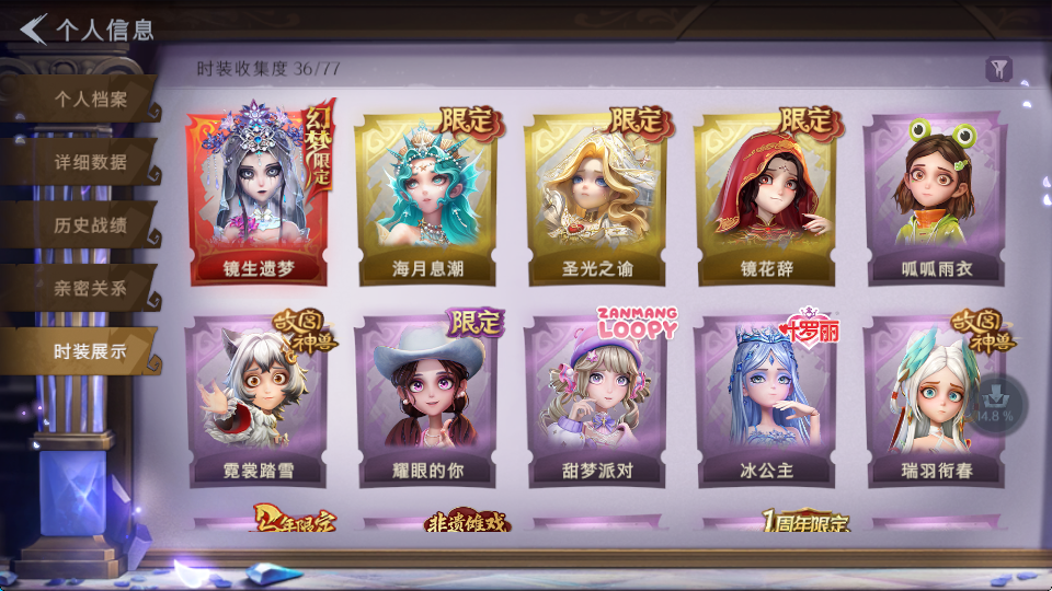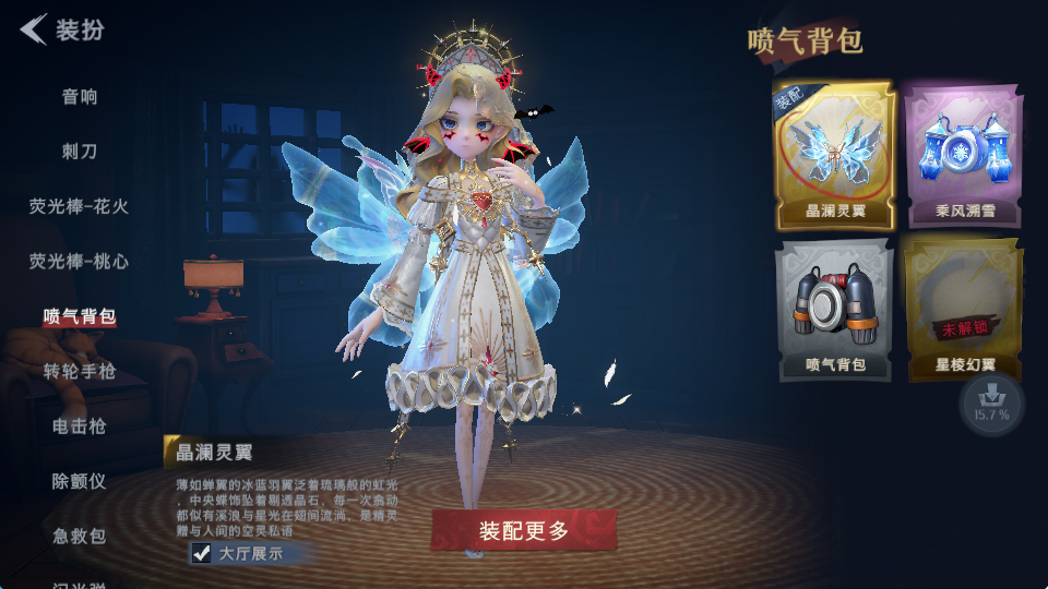 装备描述:皮肤:巫铃儿-镜生遗梦,巫铃儿-镜花辞,薇薇安-海月息潮,薇薇安-圣光之谕,逍遥-泽引山海,爱丽丝-冰公主,爱丽丝-甜梦派对,逍遥-万迭云华,零-青云逸歌,薇薇安-白光莹,莉莉-情公主,艾伦-黎明猎手,逍遥-绣春逍影,阿念-灵昭鹿鸣,零-搬开山,莉莉-莓果陷阱,莉莉-除妖小师妹,小黄-霓裳踏雪,爱德华-梵卓之礼,零-磨砺成锋,爱丽丝-瑞羽衔春,小黄-呱呱雨衣,阿念-庆宴绮愿,爱丽丝-耀眼的你,阿念-王子与骑士,阿念-迷途僵宝;道具:喷气背包-晶澜灵翼,腰包-惊魂娃娃,长鞭-缚誓之锁,长鞭-新春炸响,音响-月光奏鸣曲,伞-郁金春信,荧光棒-花火-荧光棒-花火,葫芦-伏妖塔,急救包-末章心跳,黄牛能量饮料-青玉抱丹,黄牛能量饮料-星空特调,夜视仪-金丝眼镜,电击枪-甜蜜泡泡枪,腰包-红运福虎,除颤仪-冰晶般的代价,夜视仪-心跳眼镜,额外的背包-飞花令,腰包-宝剑八,刺刀-碧络琅环,急救包-蔷薇物语,铲子-赞萌波板糖,摸金符-祝祷词,音响-鸣沙鼓,传送按钮-昆仑镜,长枪-糖葫芦霸王枪,音响-冬夜暖忆,长鞭-飞天绫,黄牛能量饮料-珍珠芭乐莓莓,摸金符-花落