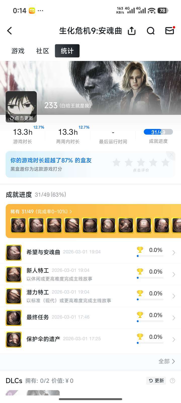 限制: 租号15次及以上 |装备描述:生化危机9安魂曲一周目已过癫狂模式已解锁